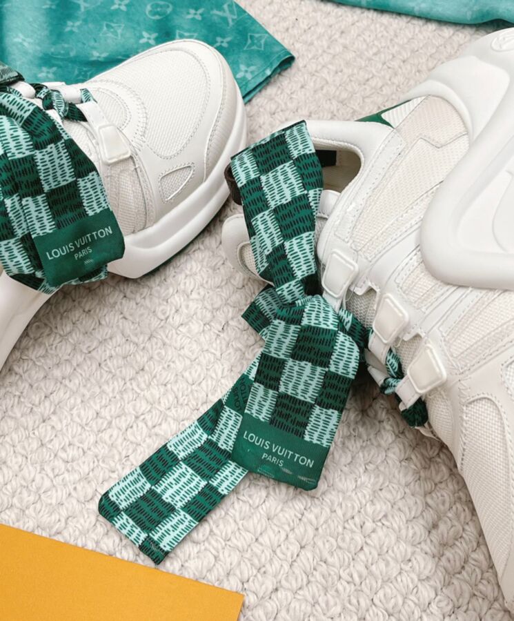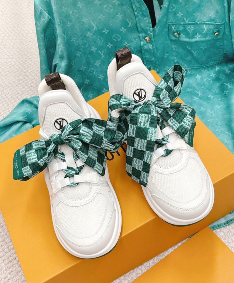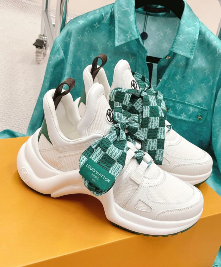 The LV Archlight sneaker is reinterpreted in a mix of materials, notably technical mesh and PVC, with ribbon laces printed with a Damier pattern. wave-shaped outsole, which discreetly adds extra height. This model is finished with a back loop in Monogram canvas.
