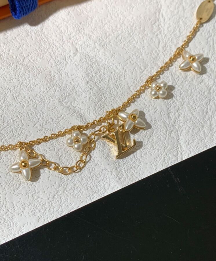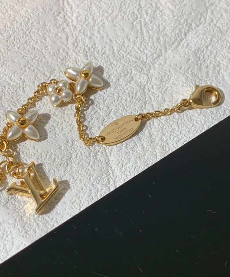 The LV Floragram bracelet features a romantic design. Monogram Flowers hang from the first row of the bracelet, while an LV Initials charm on the second row adds a refined House touch. The pearl-effect resin beads decorating the petals add visual contrast while complementing the piece’s delicate sensibility.
