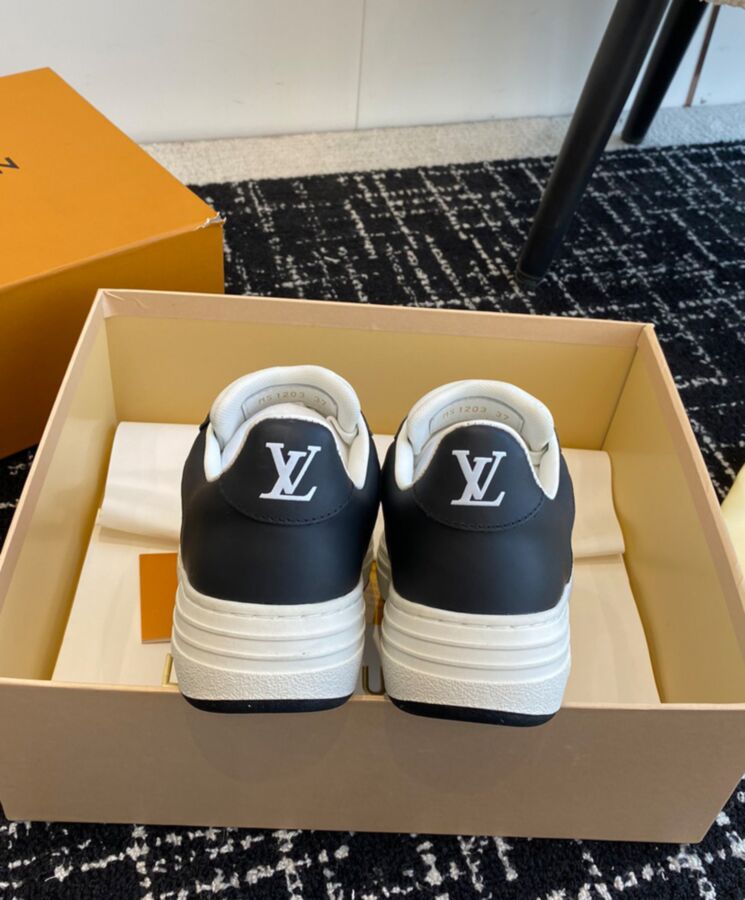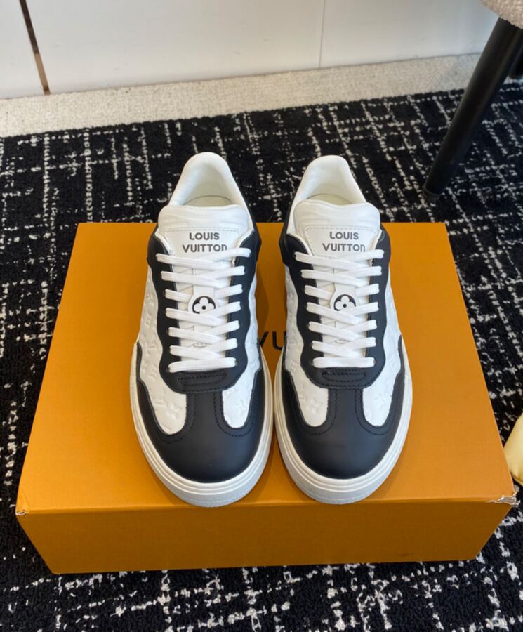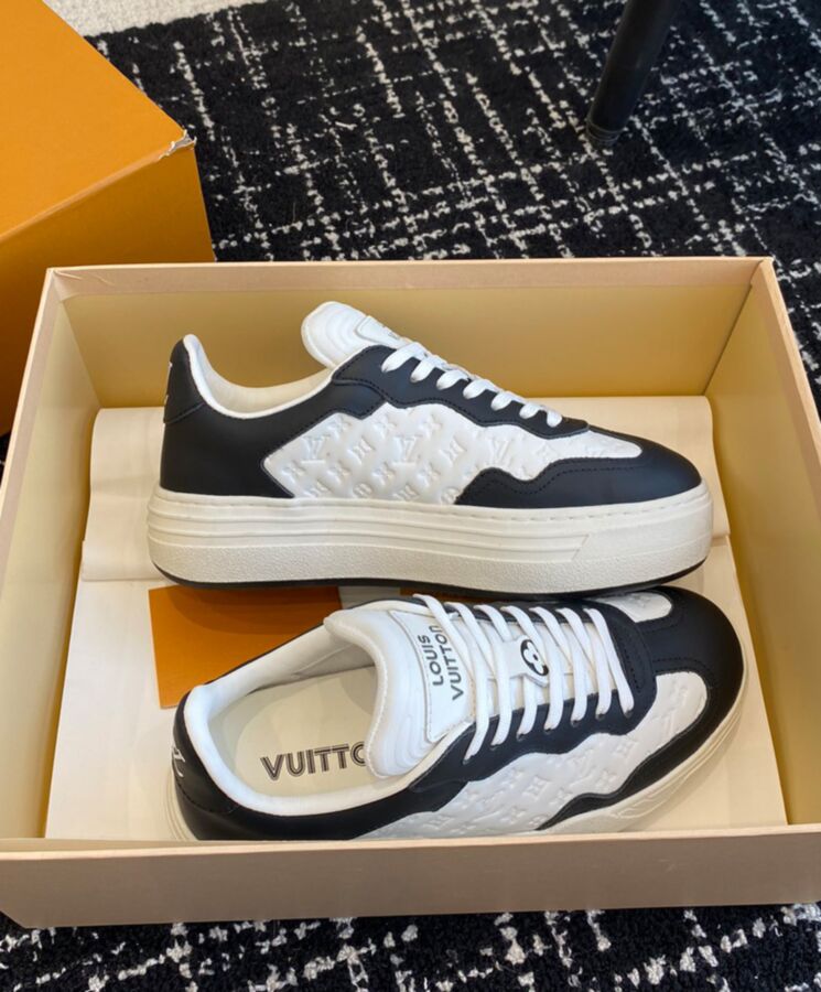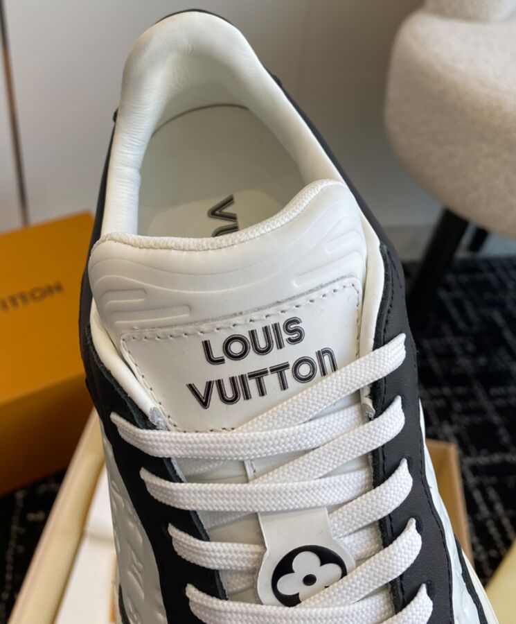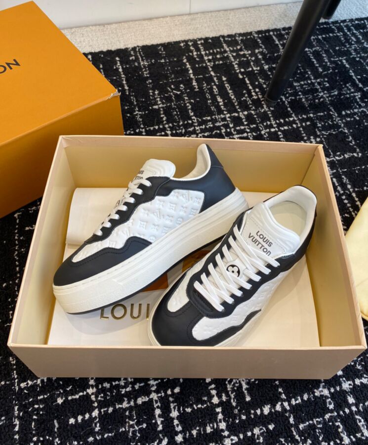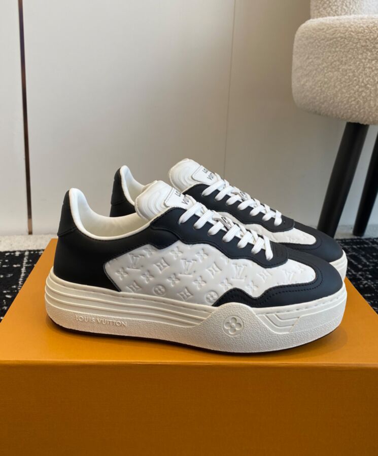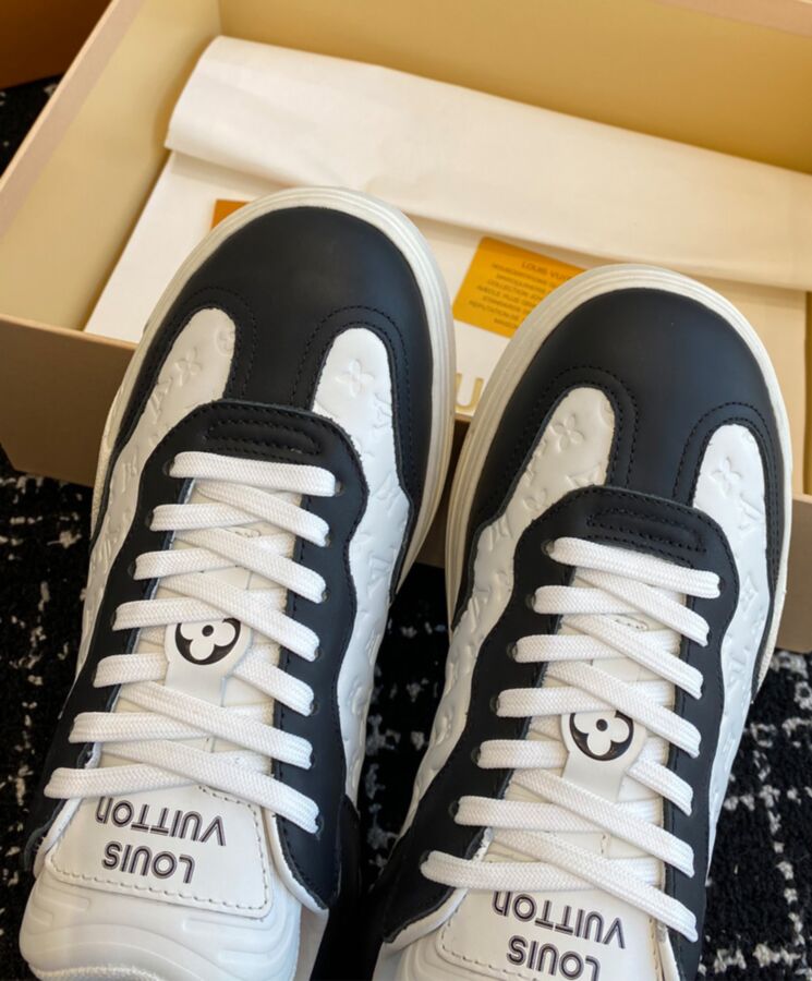 The LV Groovy platform sneaker comes in soft calf leather, which is debossed with Louis Vuitton’s iconic Monogram pattern. This model combines a Seventies-inspired upper with an oversized, elevated outsole. Key details include the Monogram Flower lace accessory, the natural leather trim at the back, and the specially designed Louis Vuitton signature on the tongue.