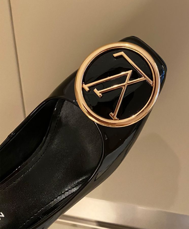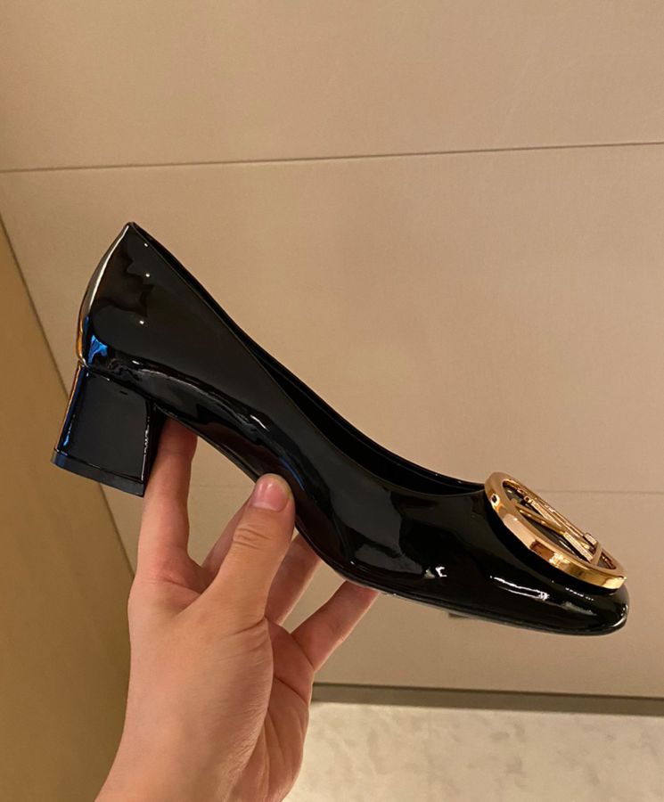 The shiny lacquered calfskin combined with a square pointed toe and a blocky low-heel design presents the retro atmosphere of Madeleine high-heeled shoes. One of the iconic Louis Vuitton shoes, decorated with a large gold round LV metal logo.