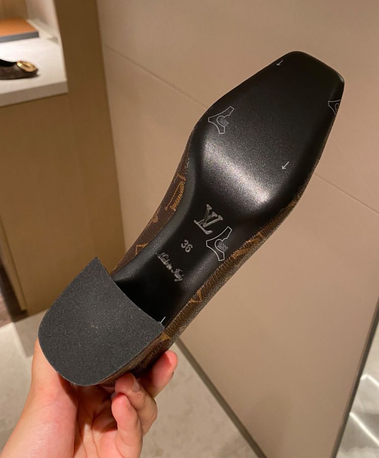 This lady-style Madeleine high-heeled shoes are made of lacquered Monogram canvas and are one of the distinctive Louis Vuitton designs. The retro square pointed toe and the blocky low heel design are quite distinctive, decorated with a large golden round LV metal logo.