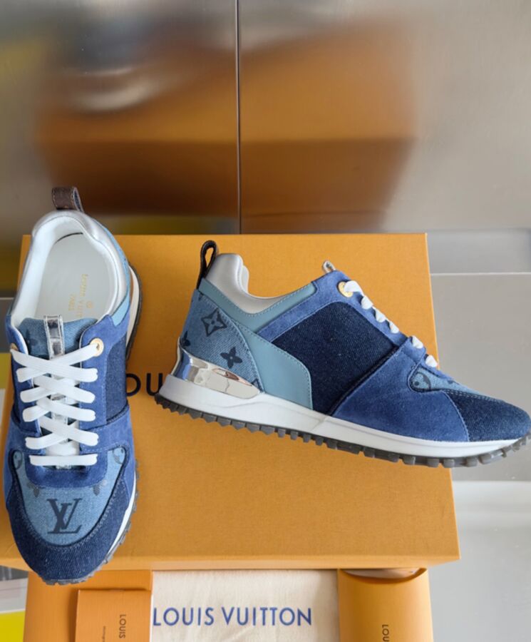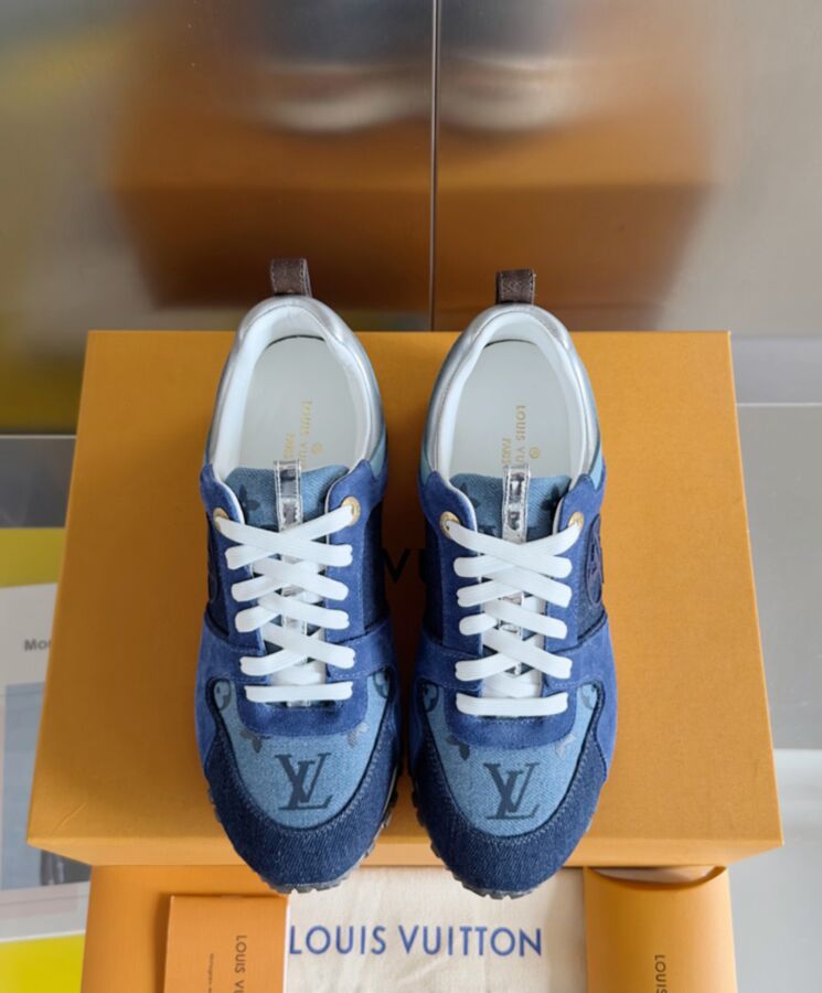 The Run Away sneaker is revisited in Monogram denim for a relaxed, summery feel. This model is elevated by rich detailing, including suede and metallic leather trim, and a silver-tone stabilizer engraved with the LV Circle logo, which also appears on the side. This sneaker has a wedge-shaped outsole and a hidden footbed to add extra height.