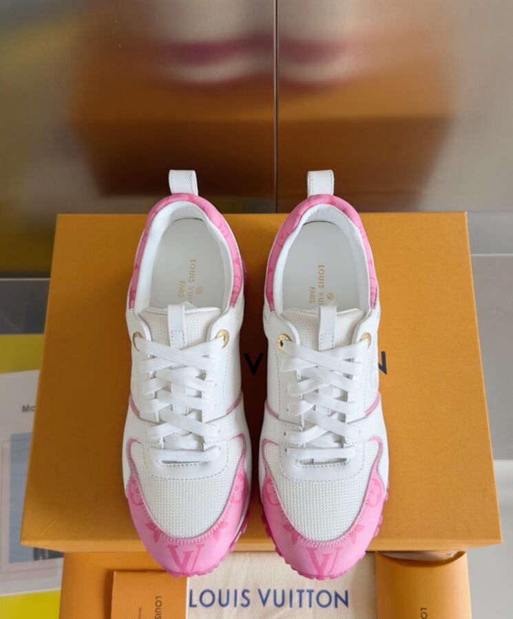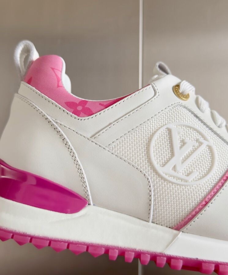 This summer version of the Run Away sneaker combines mesh and calf leather, with colorful Monogram details. A distinctive feature of this design is the fastening piece at the back, which is in a matching color to the brim, and is engraved with the signature circle of the initials LV, which also shines on the side. This model features a hidden lining, which increases the shoe’s attractive height.