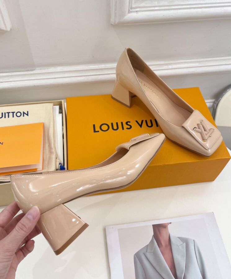 The Shake pump is a striking, modern style in high-shine patent calf leather. The upper features a distinctive leather tongue, which is embellished with an oversized LV accessory referencing the clasp of the Twist bag. This design, which is finished with a leather outsole, is also notable for the graphic V-shape of its low block heel.