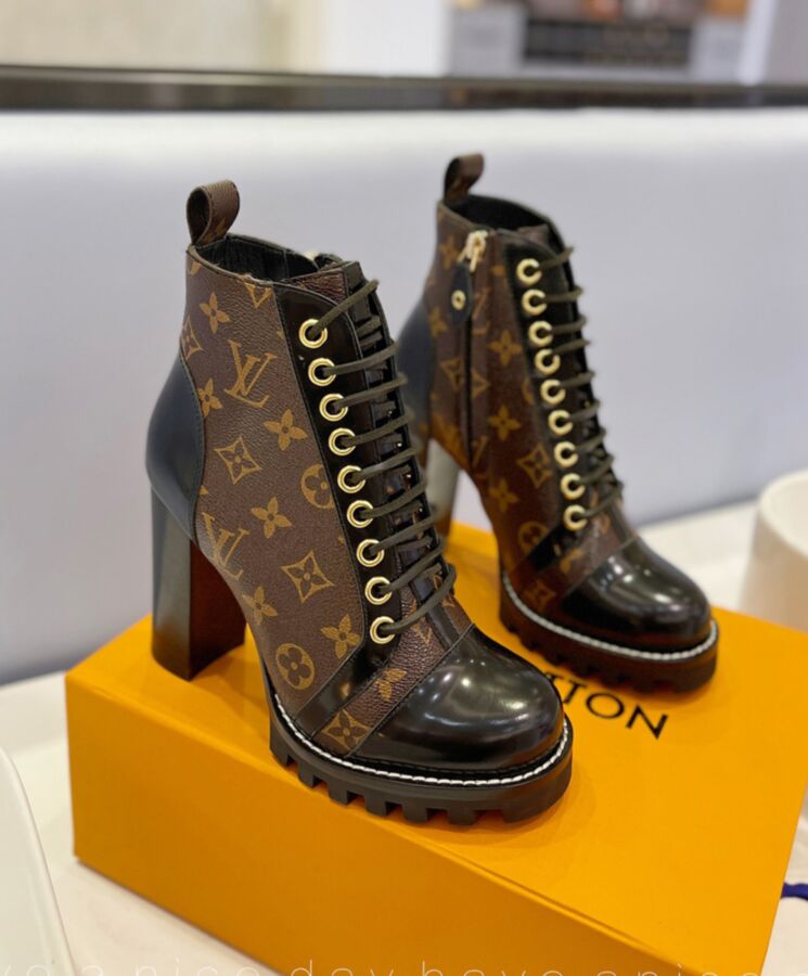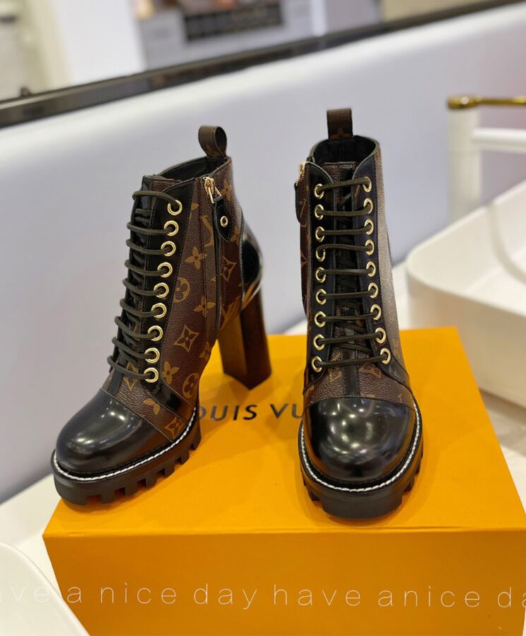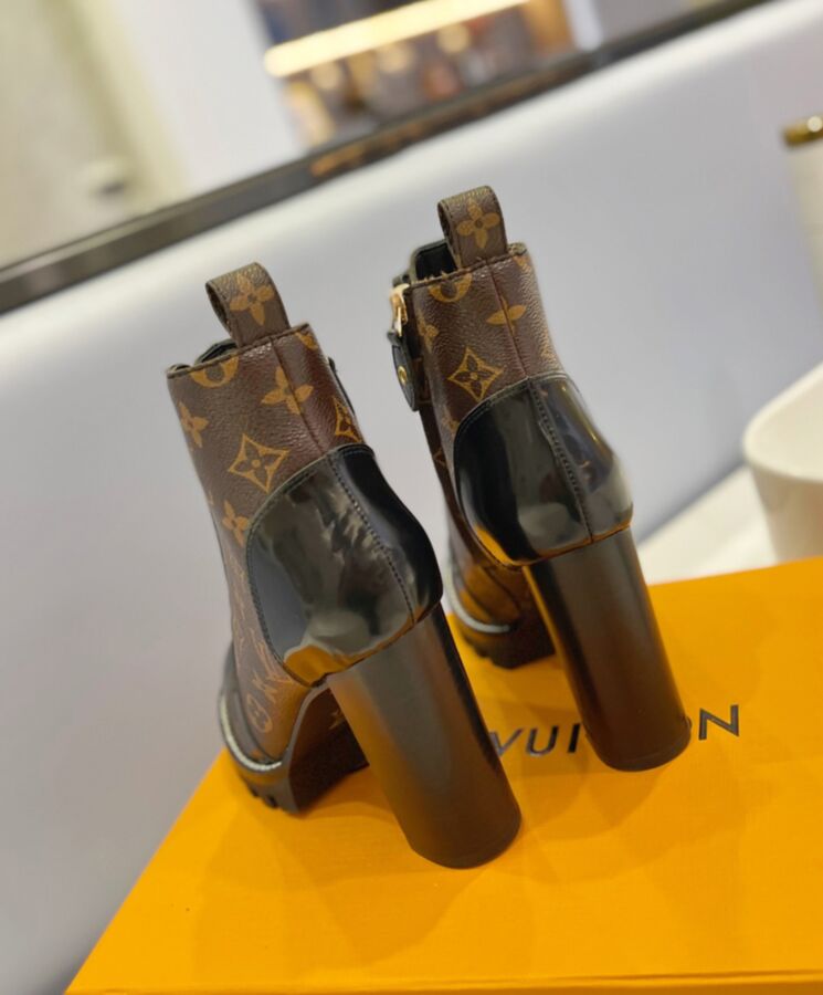 The now iconic Star Trail lace-up boot is reinterpreted this season in the iconic Monogram canvas Patent Monogram canvas Side zip Rubber outsole with tread 8 cm / 3.1 inch heel