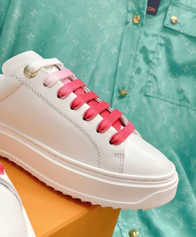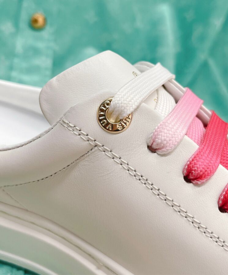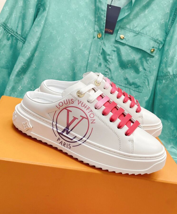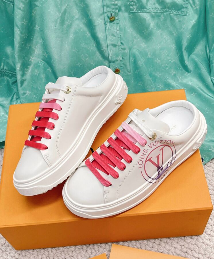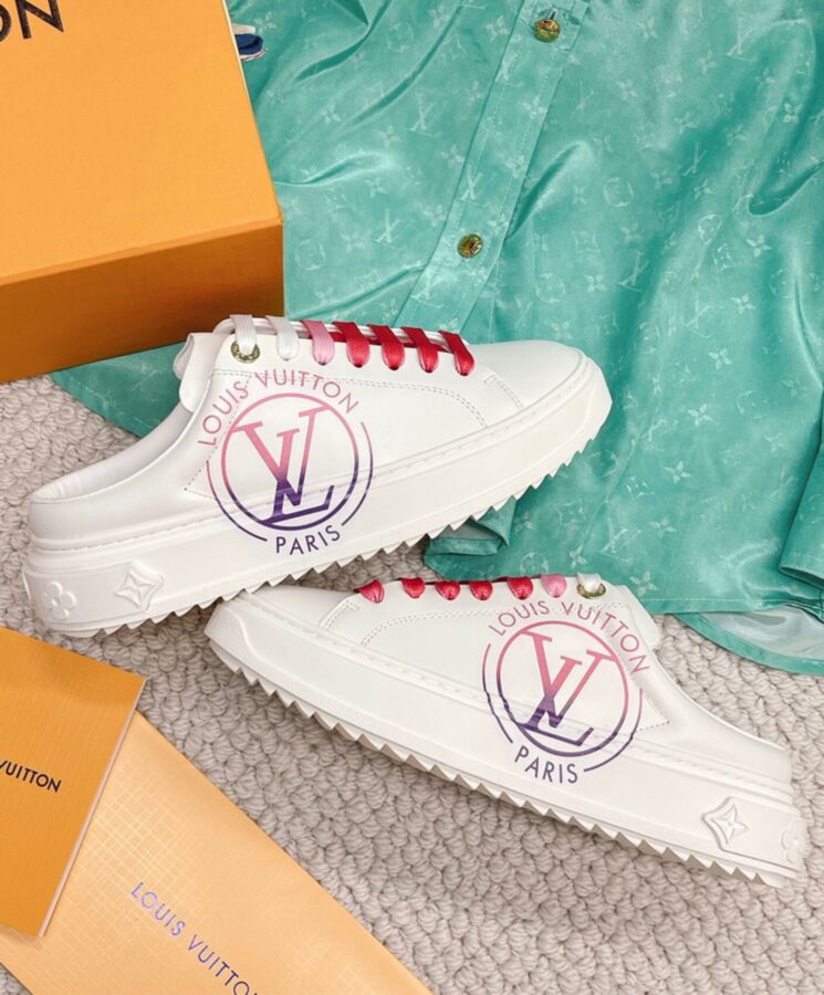The Time Out open-back sneaker is a fashion-forward rework of one of Louis Vuittons most emblematic styles. It comes in soft, printed calf leather with a color-gradient effect on both the laces and the oversized LV Circle logo on the side. This model is characterized by its elevated outsole, which is debossed with Monogram-Flower motifs.