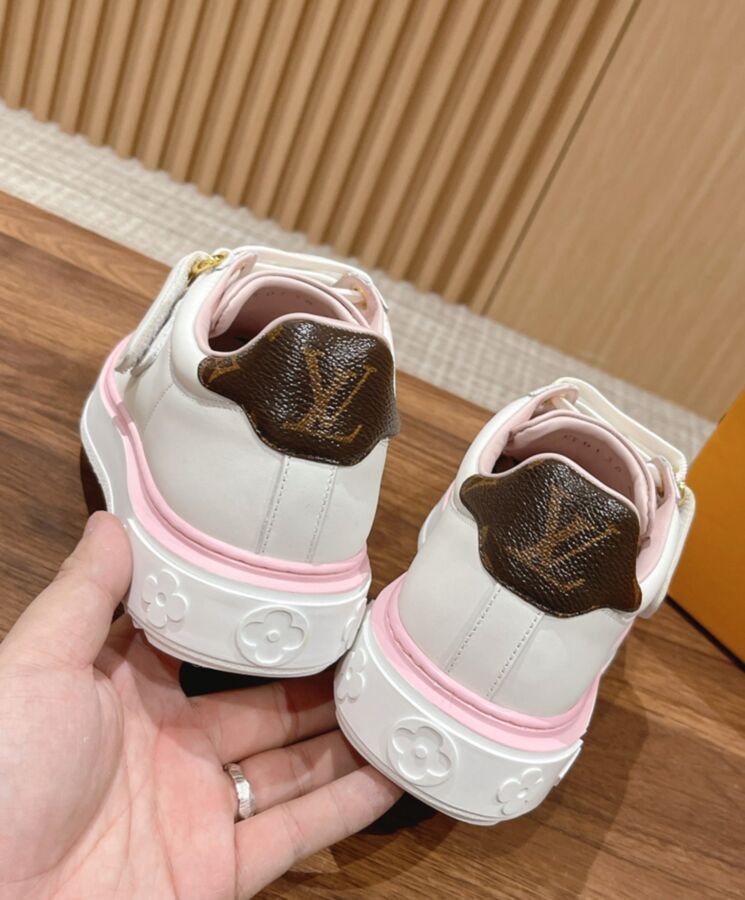 The emblematic Time Out sneaker in smooth calf leather is reworked this season with an adjustable velcro strap over its laces. True to the refined detailing characteristic of this model, the strap is embellished with a gold-tone LV Initials accessory and an embossed Louis Vuitton signature. A fashionable elevated outsole completes this design.