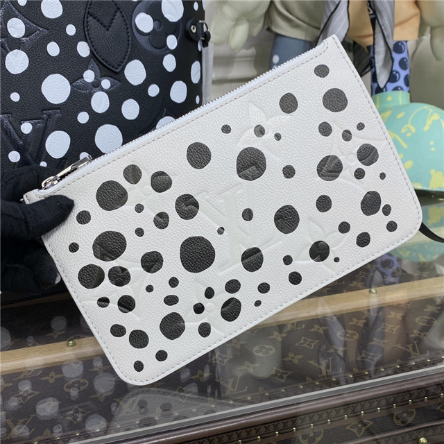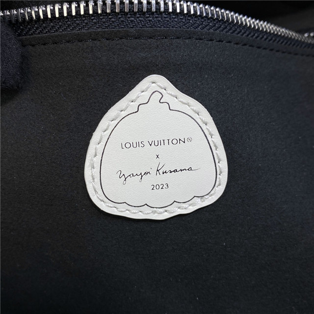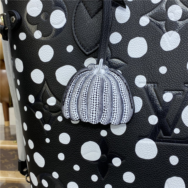 The new Louis Vuitton x Yayoi Kusama collection is a monument to art and fine craftsmanship. The renowned Japanese artist is known for her signature use of dots as a symbolic evocation of infinity. The LVxYK Neverfull MM features a galaxy of white dots on lustrous black Monogram Empreinte cowhide. An ultra-functional tote, it comes with a removable pouch and a pumpkin-shaped charm, a reference to another of Kusama’s emblems.
