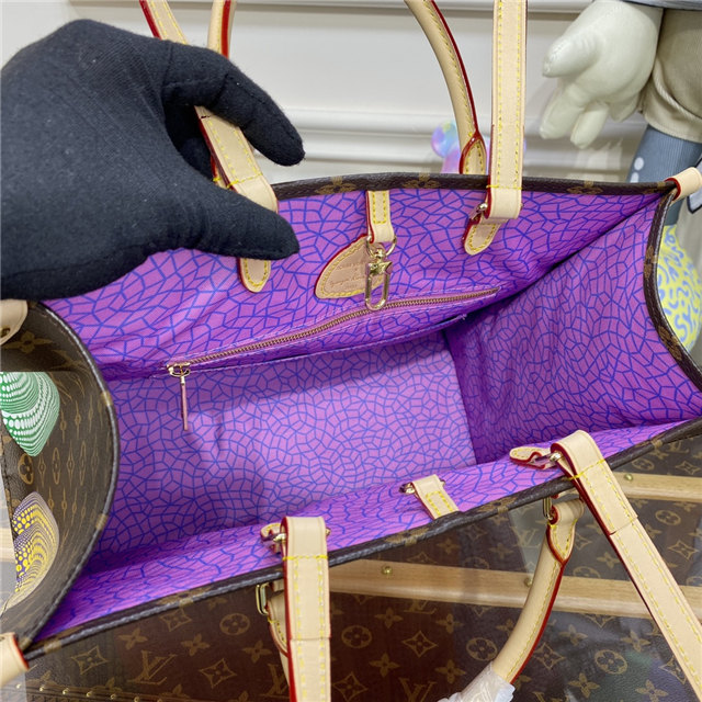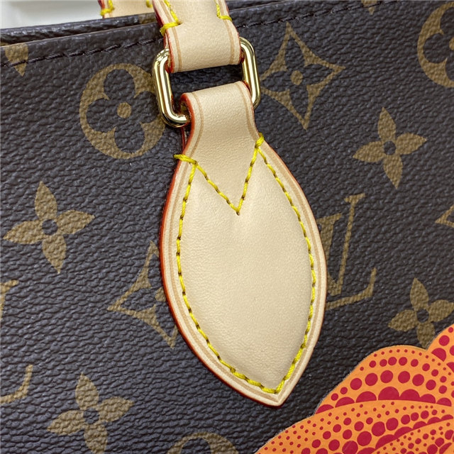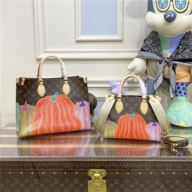 Featured in the exceptional new Louis Vuitton x Yayoi Kusama collection, this version of the LVxYK OnTheGo MM was inspired by a key theme in the celebrated Japanese artist’s work: pumpkins, a symbol of comforting warmth. Monogram canvas is printed with a row of stylized pumpkins in cheerful colors, punctuated with Kusama’s signature dots. A handy, capacious bag that’s sure to become a collector’s piece.