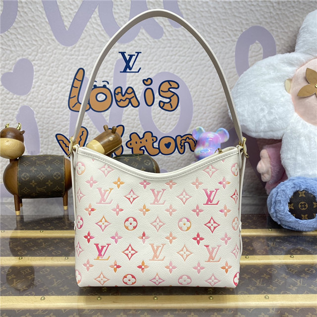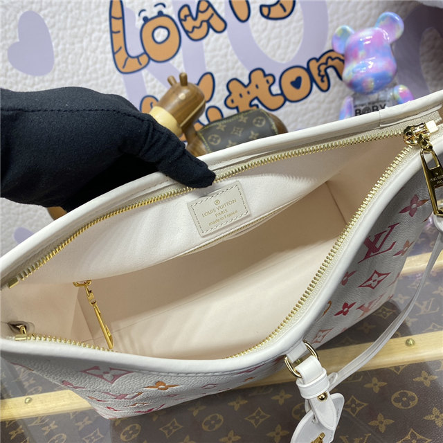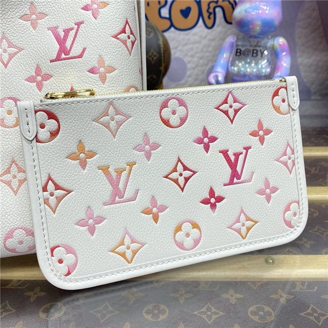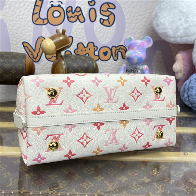 The CarryAll PM’s supple design is even more body-friendly in Monogram Empreinte leather. The sunrise colorway of the Monogram print – orange, pink and fuchsia – brings an optimistic feel; an effect amplified by the gradient “watercolor” aspect of the LVs and Monogram Flowers. A removable and adjustable strap enable comfortable shoulder carry.