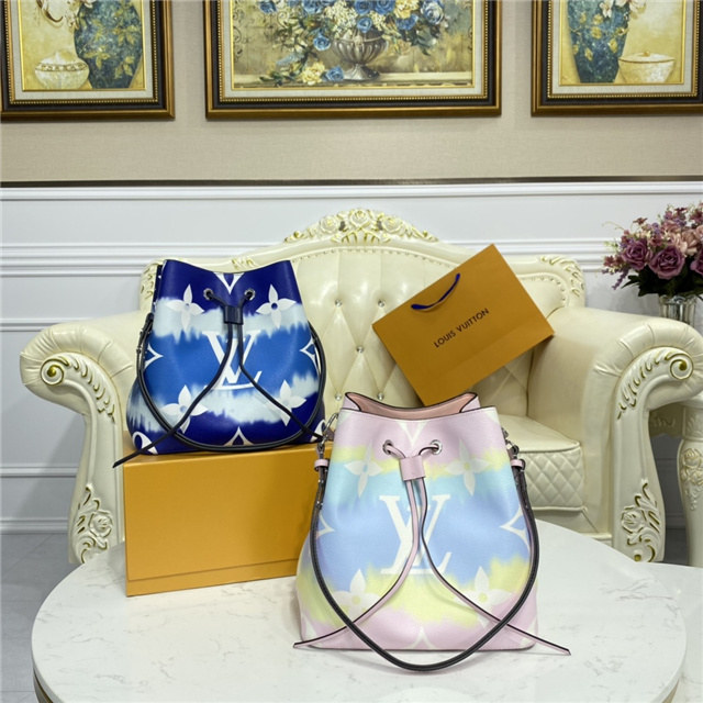 The NéoNoé bucket bag comes in Tie-Dye Monogram canvas for the LV Escale Collection. Present across Louis Vuitton handbags, shoes and ready-to-wear this season, this unexpected motif is inspired by the Japanese Shibori technique of knotting fabric before dyeing it. A lightweight bag, with a removable strap for a shoulder or cross-body carry.