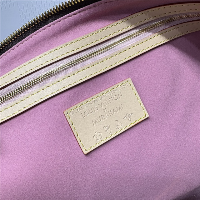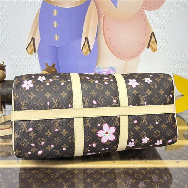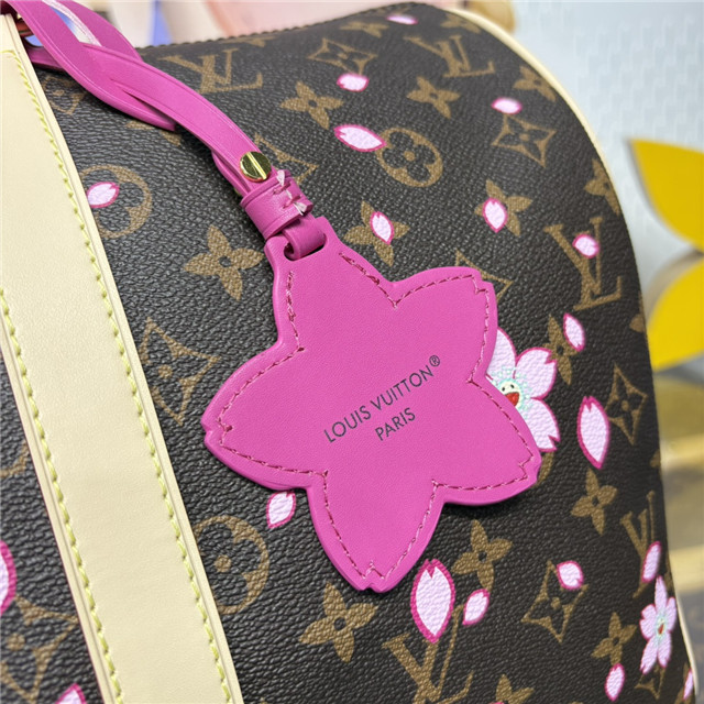A true icon of the House, this playful version of the Keepall Bandoulière 45 twists a classic Monogram coated canvas finish with exuberant Cherry Blossom motifs from the celebratory re-edition of the Louis Vuitton x Takashi Murakami collection. The bag includes a keybell knot with padlock as well as a charm with the flower of the artist Murakami.