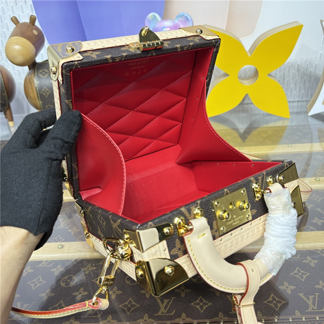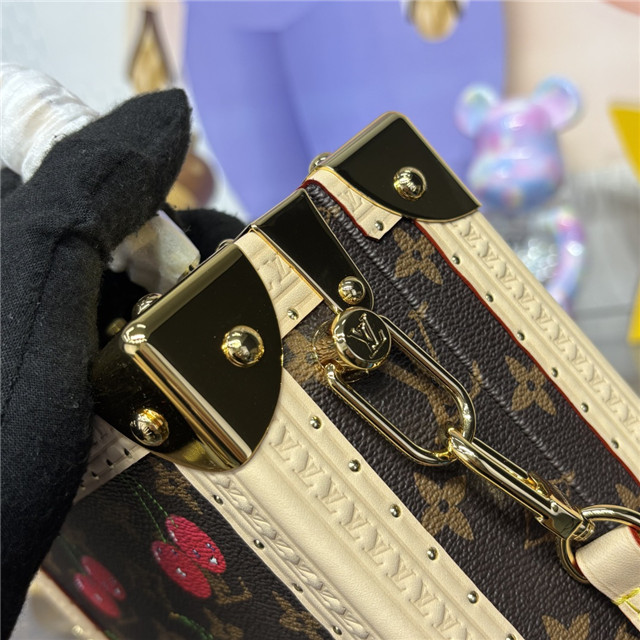 Projecting timeless House codes in playful proportions, the Mini Square Trunk is clad in classic Monogram coated canvas detailed with kawaii cherry motifs as part of the spirited second edition of the Louis Vuitton x Takashi Murakami collection. The edges are trimmed with natural cowhide leather and finished with gleaming golden hardware, including riveted corners. A curvaceous top handle and removable strap offer multiple carry options.