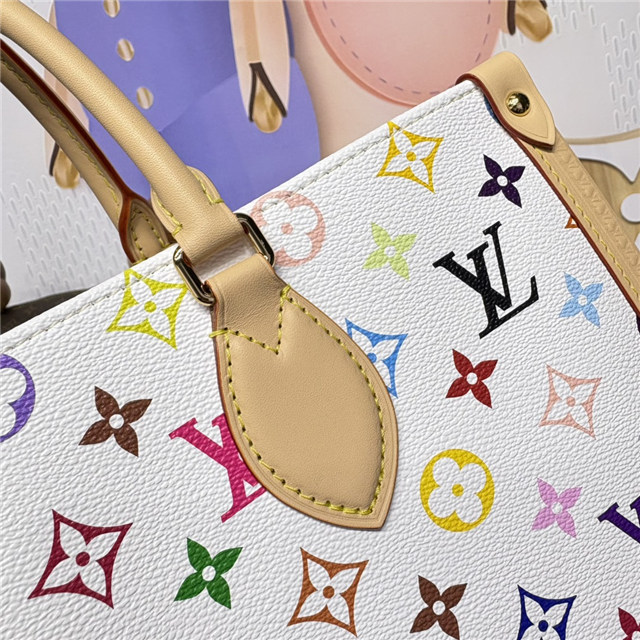 This exclusive edition of the iconic OnTheGo MM handbag makes a spirited statement in the Louis Vuitton x Murakami collection’s multicolored Monogram canvas trimmed with emblematic natural cowhide leather. Elegant gold-toned corners subtly mimic detailing on the House’s heritage travel trunks, while an LV x TM keybell adds a final signature flourish from the collaboration. Complete with shoulder straps and two top handles for versatile carry options.