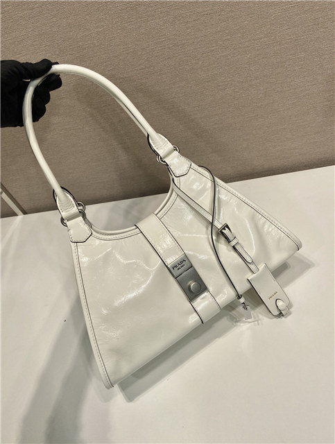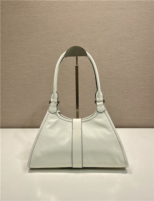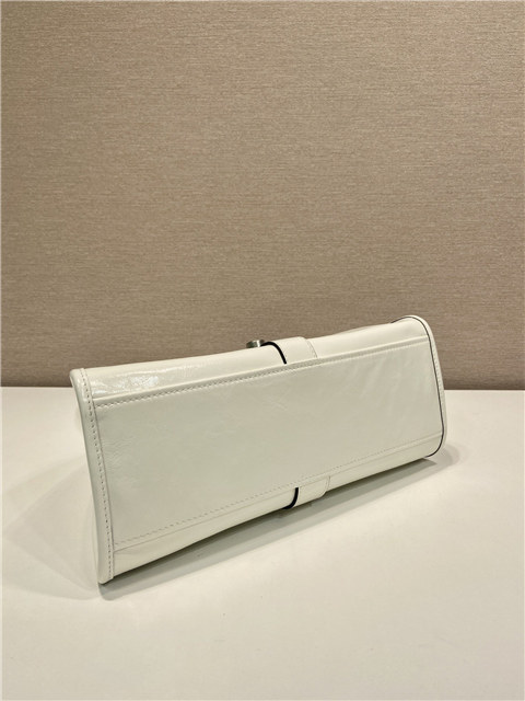 Geometric lines and refined artisan details define this bag with soft volumes. The trapezoidal silhouette features elongated handles to be worn with ease also as a shoulder bag. The vertical clasp inspired by the archives and the leather mirror complete the accessory with a sophisticated note.