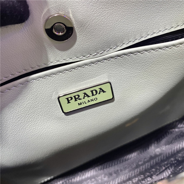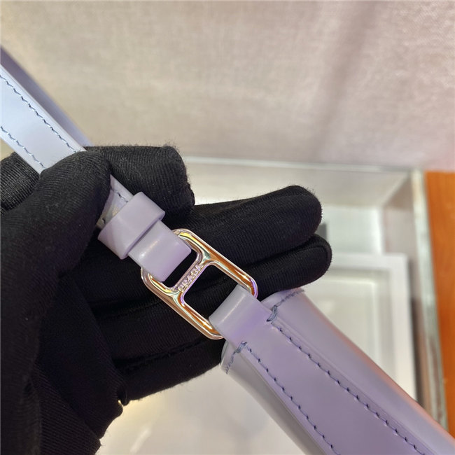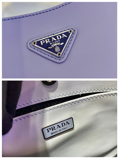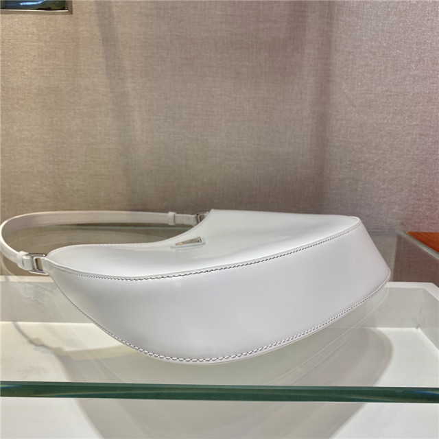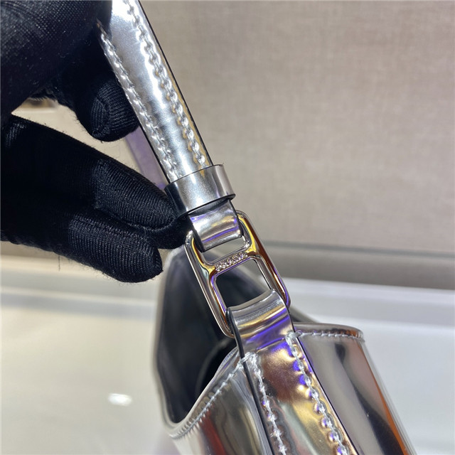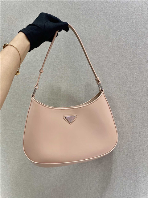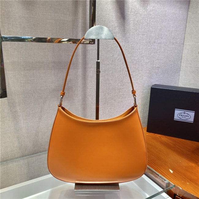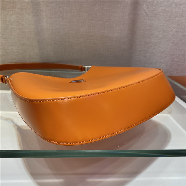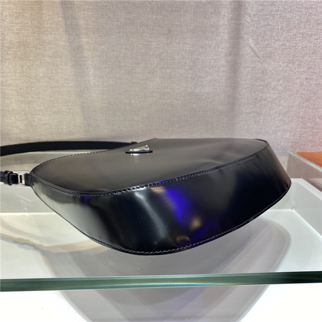 The Prada Cleo bag with sophisticated allure reinterprets an iconic design of the brand from the 1990””””””””s. Sleek curved lines emphasized by the particular construction rounded on the bottom and sides give this hobo bag a soft, light look. Brushed leather, a modern and versatile material that is distinctive in Prada collections, is ideal for creating always new combinations and contrasts. The enamel triangle logo decorates the silhouette.