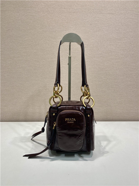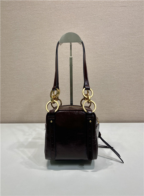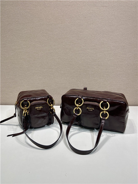 The top-handle bag has a new square shape and is made of soft leather with a vintage finish. Its retro charm is emphasized by the antiqued metal hardware and the archive-inspired zipper pocket.