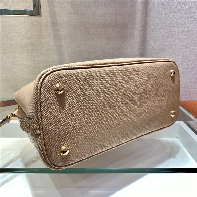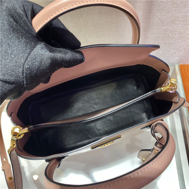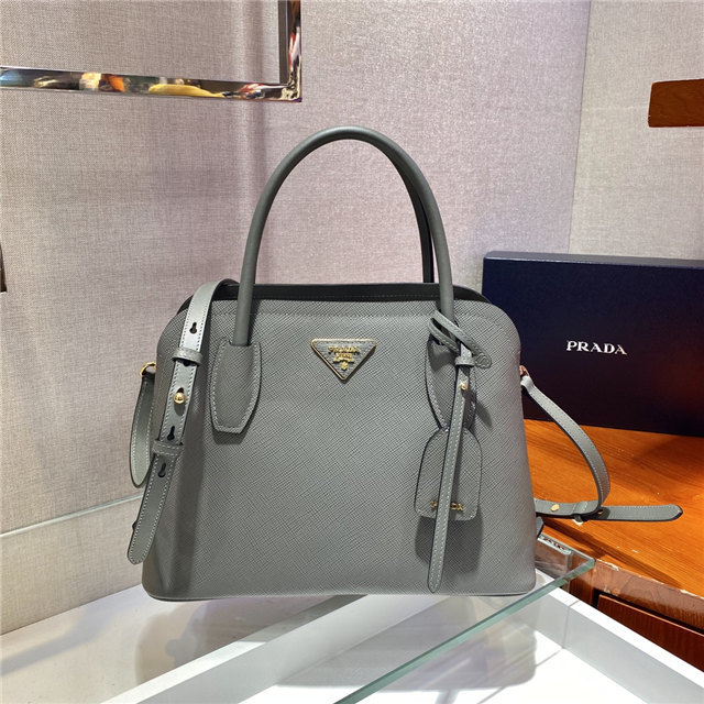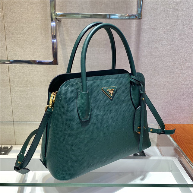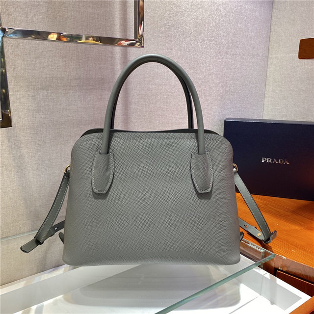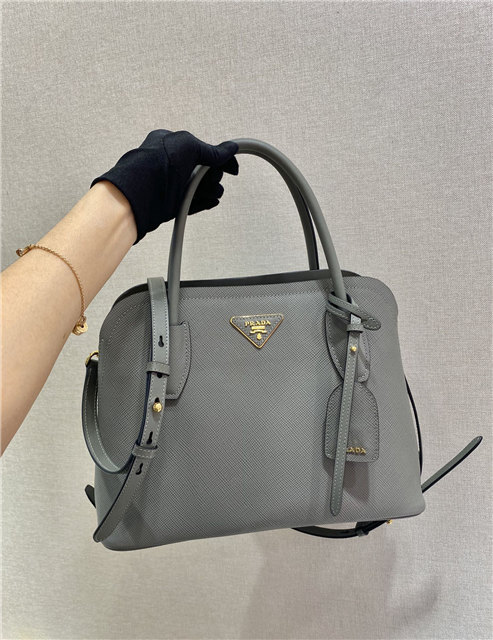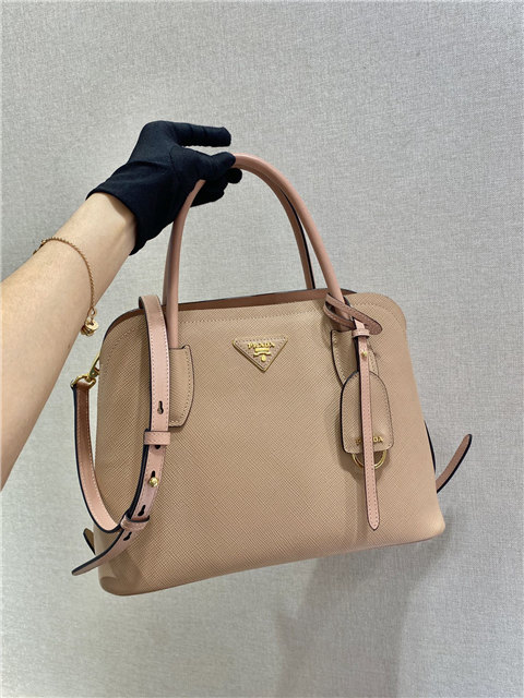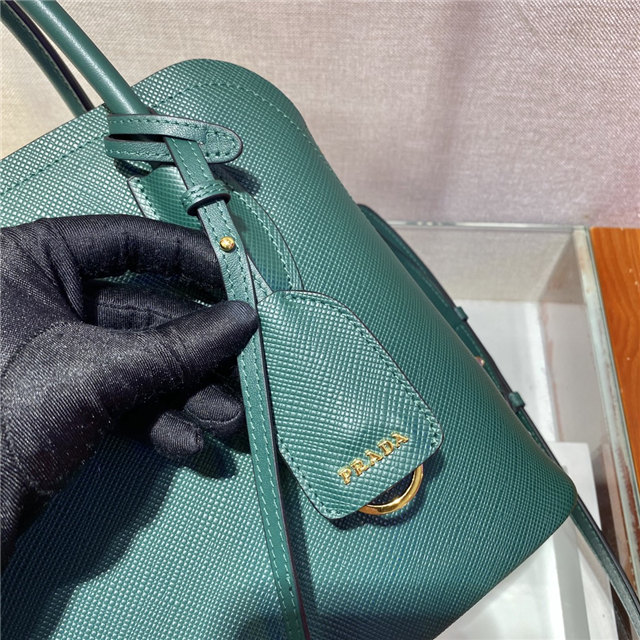The Prada Matinée bag embodies the modernist elegance of Prada. Made of classic Saffiano leather with a silhouette that is both structured and curvy, the bag is decorated with the metal logo on a tonal Saffiano leather triangle. A detachable shoulder strap and name tag complete the accessory.