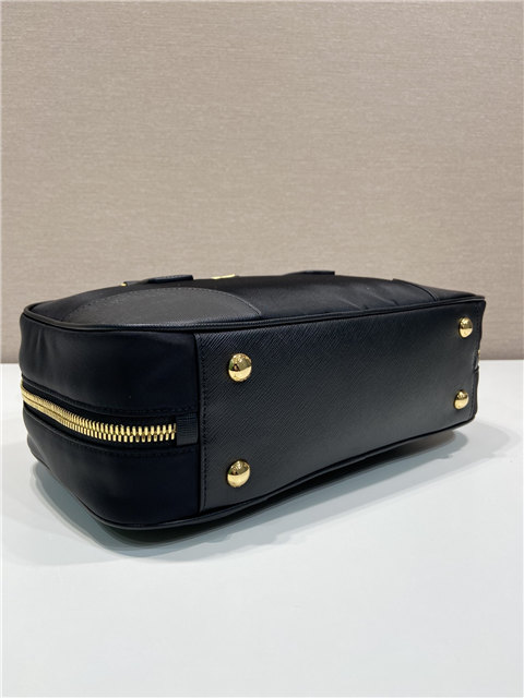 An archive silhouette with timeless appeal is presented in Re-Nylon, the sustainable evolution of a distinctive material of the brand. The two-handle bag made of regenerated nylon is enriched with Saffiano leather details in a perfect synthesis of Prada”s stylistic codes, able to subvert the traditional perception of luxury. Between the pragmatic touches and sophisticated details, the enameled metal triangle logo decorates the accessory with its distinctive signature note.