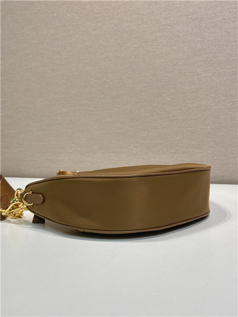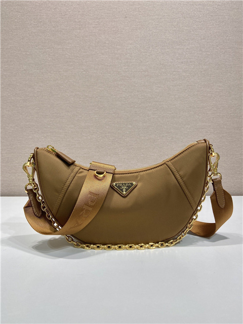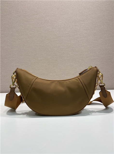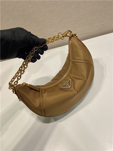This versatile and refined Re-Nylon bag combines archive shapes with pragmatic, contemporary style. The half-moon silhouette can be worn in different ways, thanks to the detachable sporty shoulder strap and the refined chain handle. The accessory is decorated with the iconic enameled metal triangle logo.