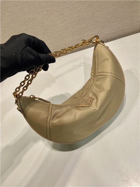 This versatile and refined Re-Nylon bag combines archive shapes with pragmatic, contemporary style. The half-moon silhouette can be worn in different ways, thanks to the detachable sporty shoulder strap and the refined chain handle. The accessory is decorated with the iconic enameled metal triangle logo.