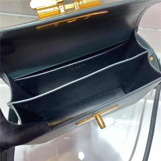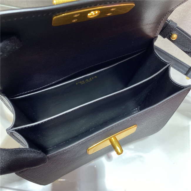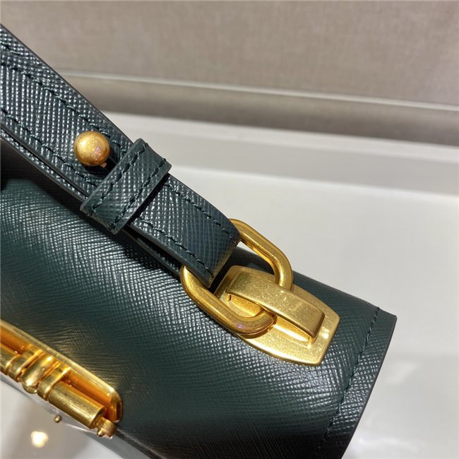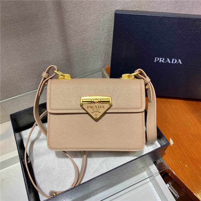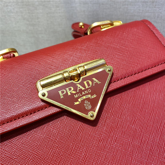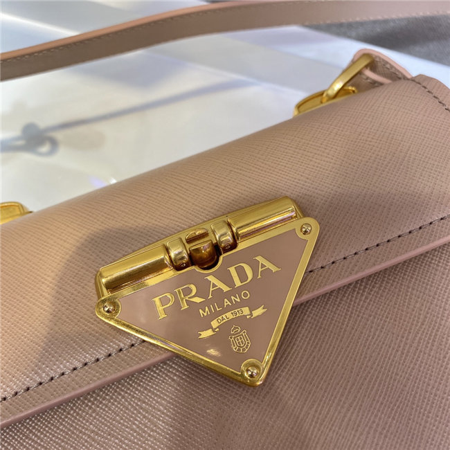 This sleek shoulder bag made of Saffiano leather features a new clasp with the iconic triangle logo. Feminine yet functional, the accessory stands out for its metal hardware reminiscent of the type used on luggage.