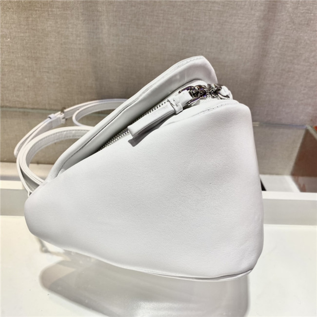 A study of the triangle inspires new geometric details and unique interpretations of the historic Prada logo. The iconic shape is reworked in the design of this handbag with soft reverse stitch construction, completed by a handle and detachable shoulder strap that lets it be worn in different ways.