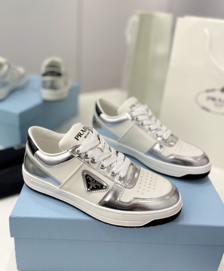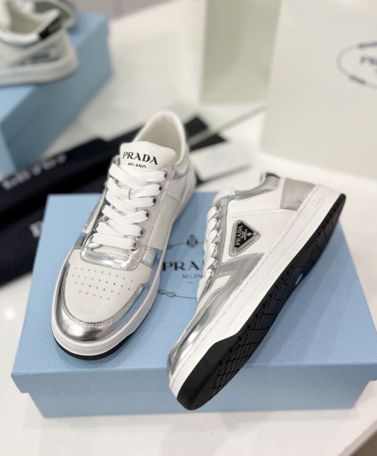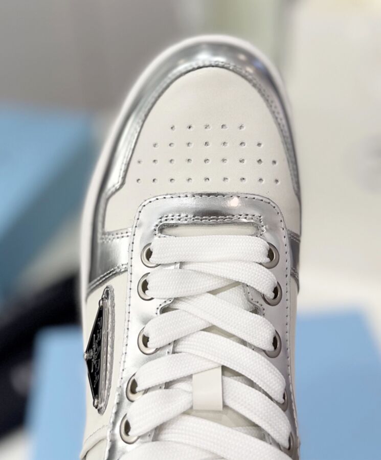 This leather sneaker interprets the Prada logo from multiple angles: it floats on the tongue, runs along the lightweight rubber sole, and becomes the iconic enameled triangle logo emblazoned on one side of the upper, all explaining the brand’s style.