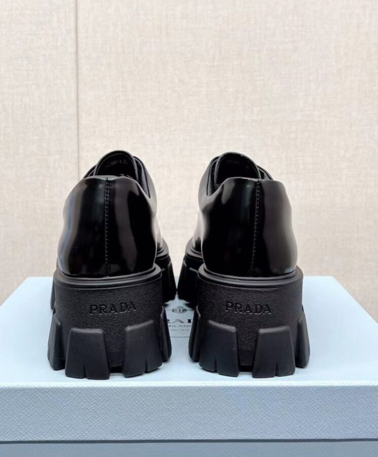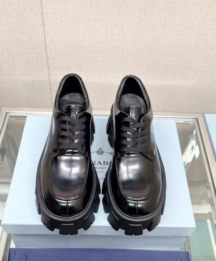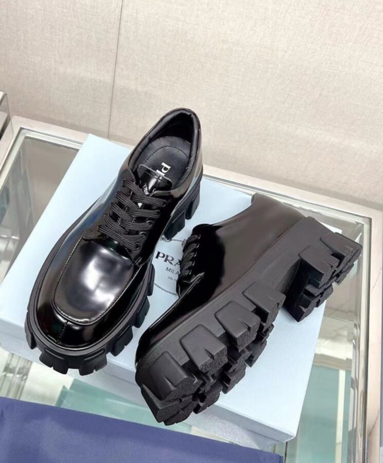 The Monolith loafers made of Prada’s iconic and elegant brushed leather reinterpret the classic penny loafer in an original and contemporary way. This shoe, which takes its name from the chunky rubber sole, is an expression of timeless design that is monolithic and unique for its research, innovation, and style.