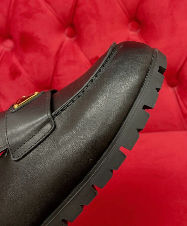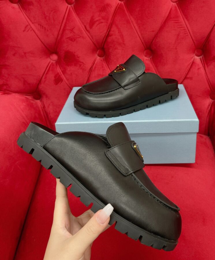 These mules with a hybrid design blend a contemporary silhouette and details inspired by formal men’s shoes. The enameled metal triangle logo embellishes the leather band while the light rubber sole adds a casual and versatile note to the design.