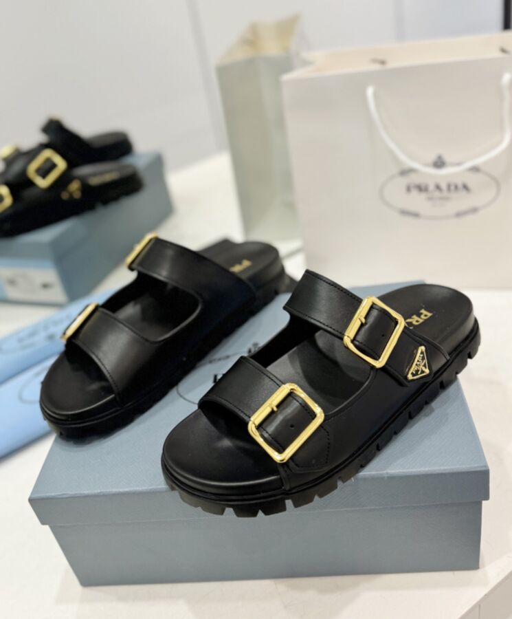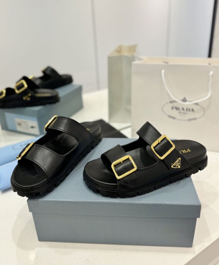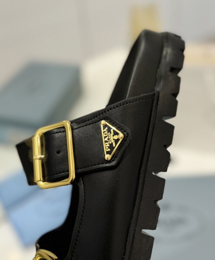 These leather slides with a casual style are defined by clean, contemporary lines. This versatile footwear characterized by straps with metal buckles are completed by rubber soles with a lug tread. The enameled metal triangle logo embellishes the style with its sleek and iconic signature touch.