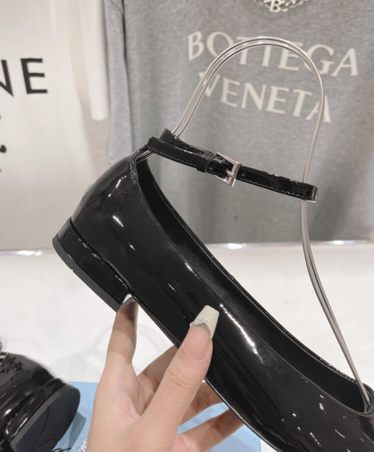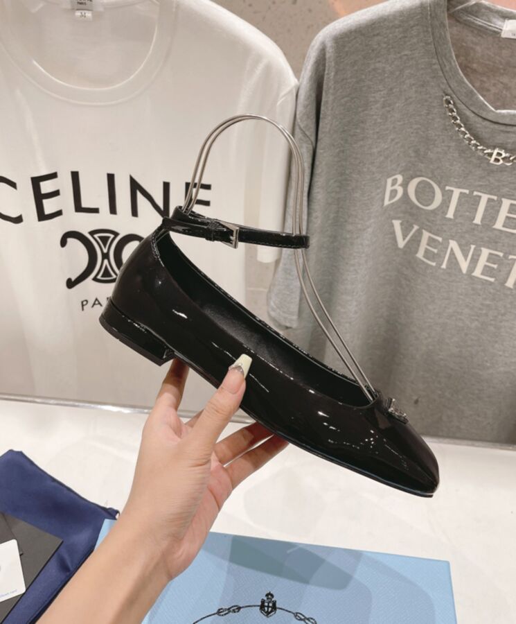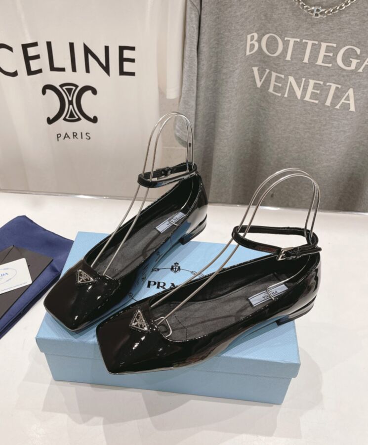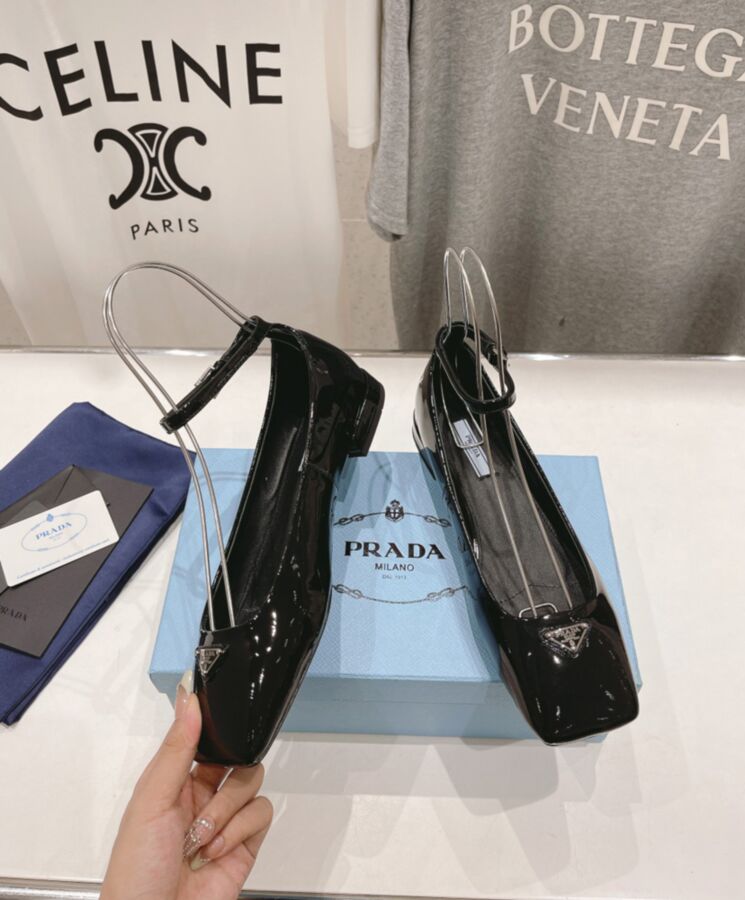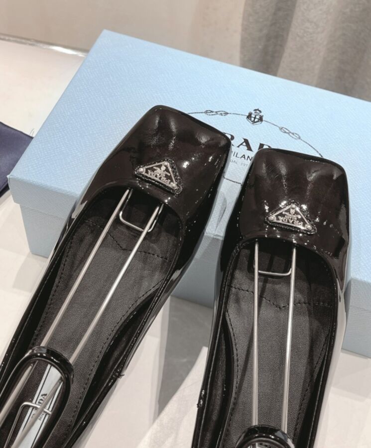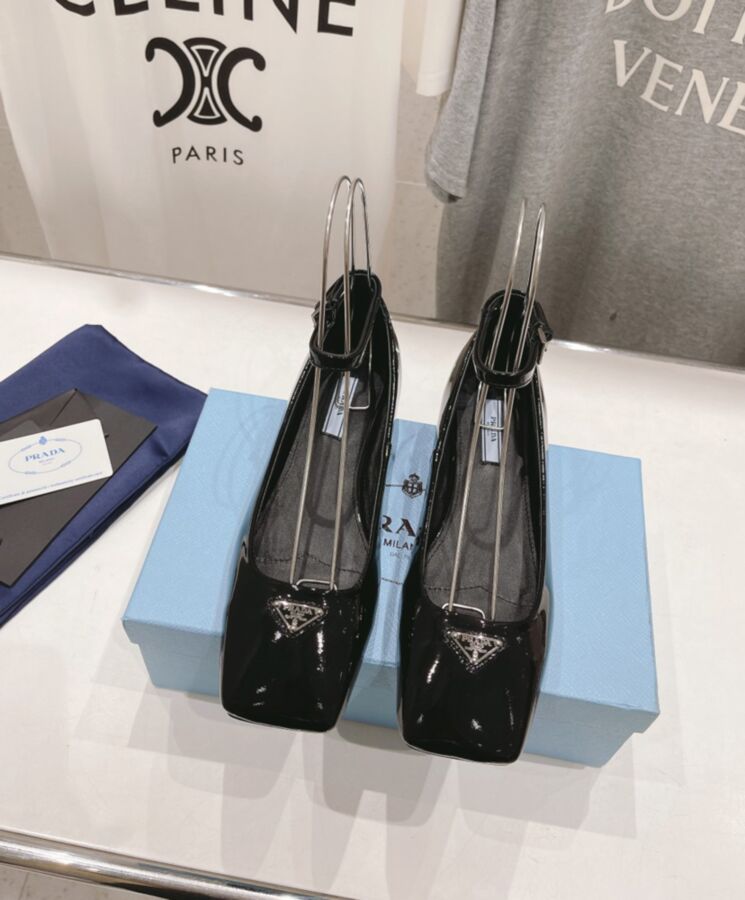 A refined, elegant silhouette with square toe characterizes these patent leather ballerinas. The shoe with ankle strap is decorated with the enameled metal triangle logo, which first appeared in 1913 on trunks made by Mario Prada.