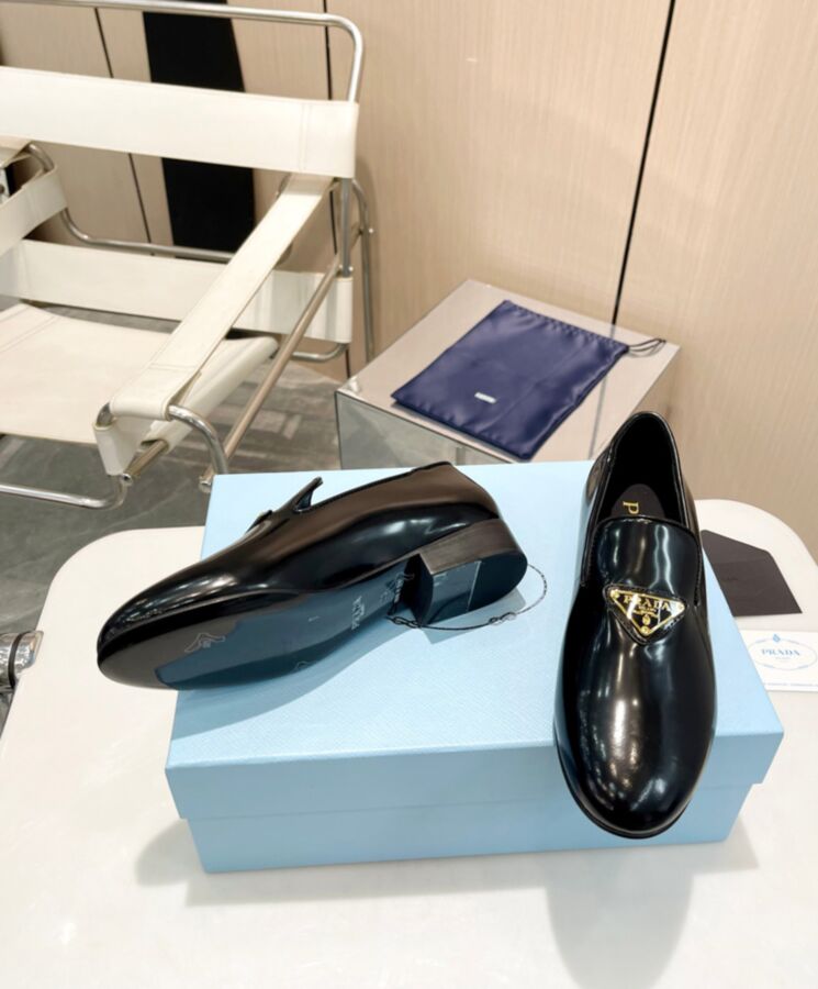 These patent leather loafers feature clean, flowing lines for a classic appeal. The elegant low-heeled tapered silhouette is embellished with the signature triangle logo in enameled metal.