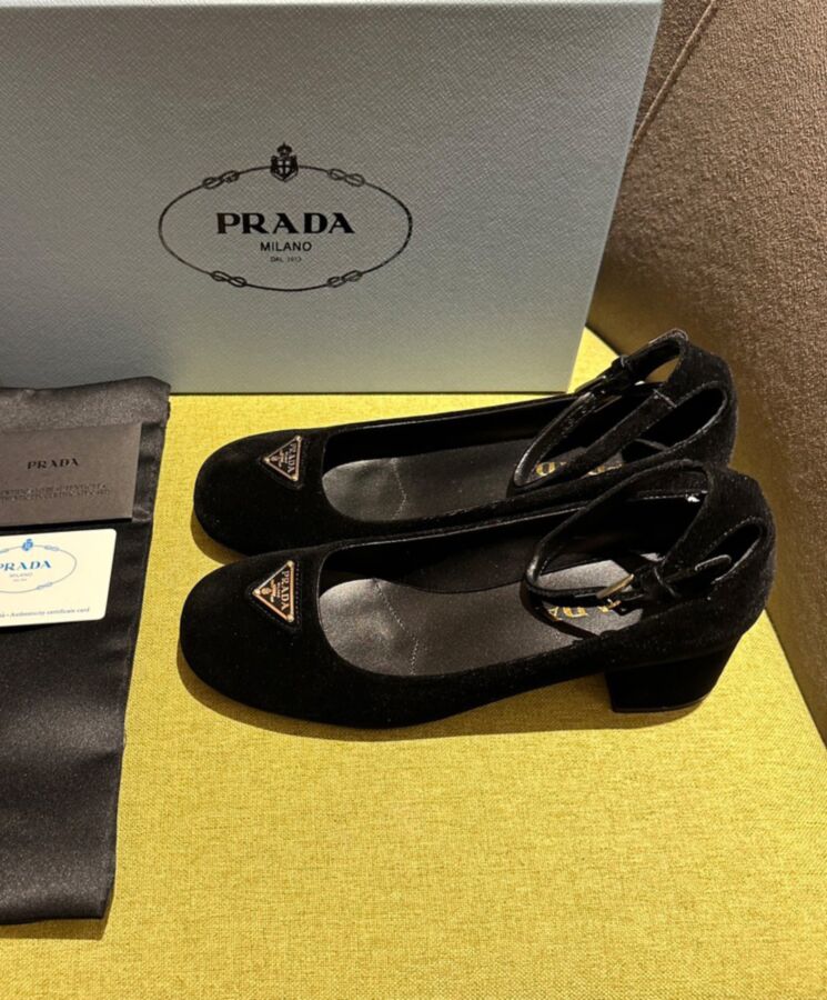 The feminine design of these sophisticated pumps is enhanced by the soft touch of the velvet that introduces a contemporary note to the timeless silhouette, defined by a refined ankle strap. The enameled metal triangle logo completes the shoe with its iconic signature.