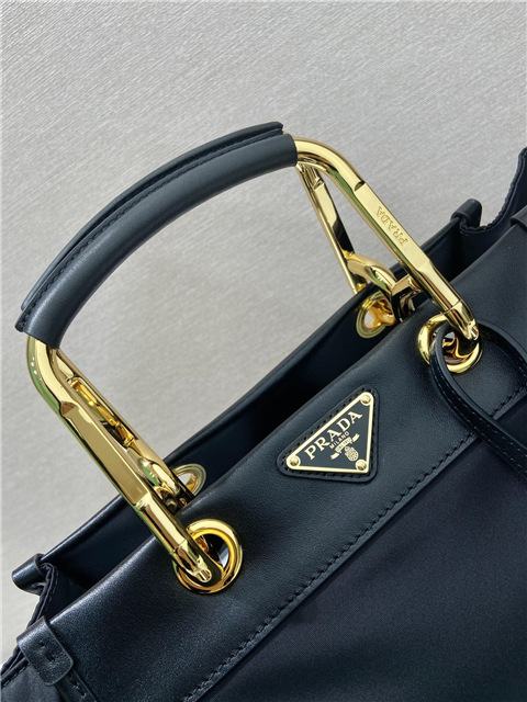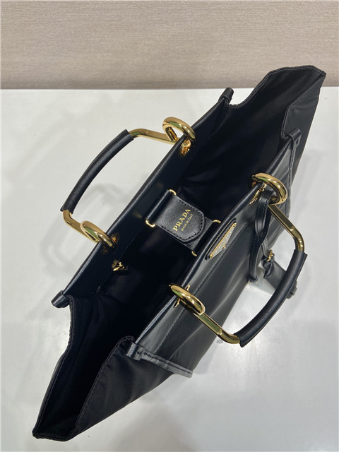 The sleek geometric shape of this tote is defined by the combination of functional Re-Nylon with sophisticated details. The style features a versatile design characterized by double handles in metal and leather for use as a handbag or shoulder bag. The accessory is embellished with the iconic enameled metal triangle logo.