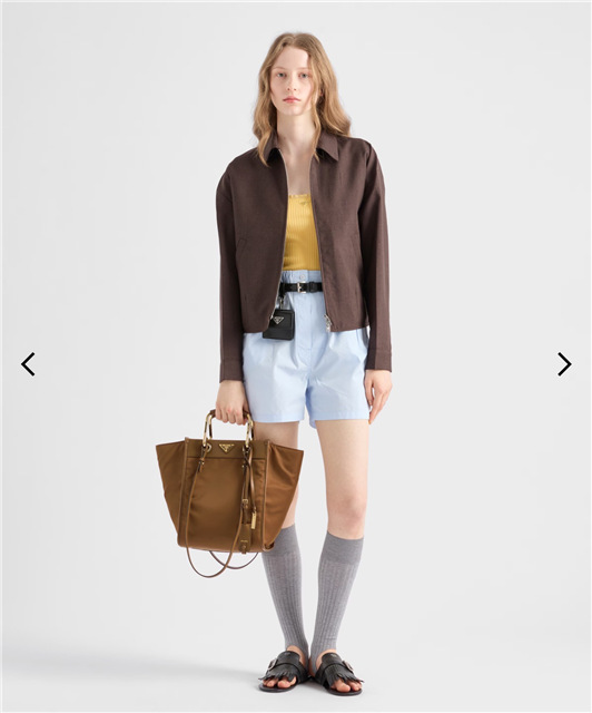 The sleek geometric shape of this tote is defined by the combination of functional Re-Nylon with sophisticated details. The style features a versatile design characterized by double handles in metal and leather for use as a handbag or shoulder bag. The accessory is embellished with the iconic enameled metal triangle logo.