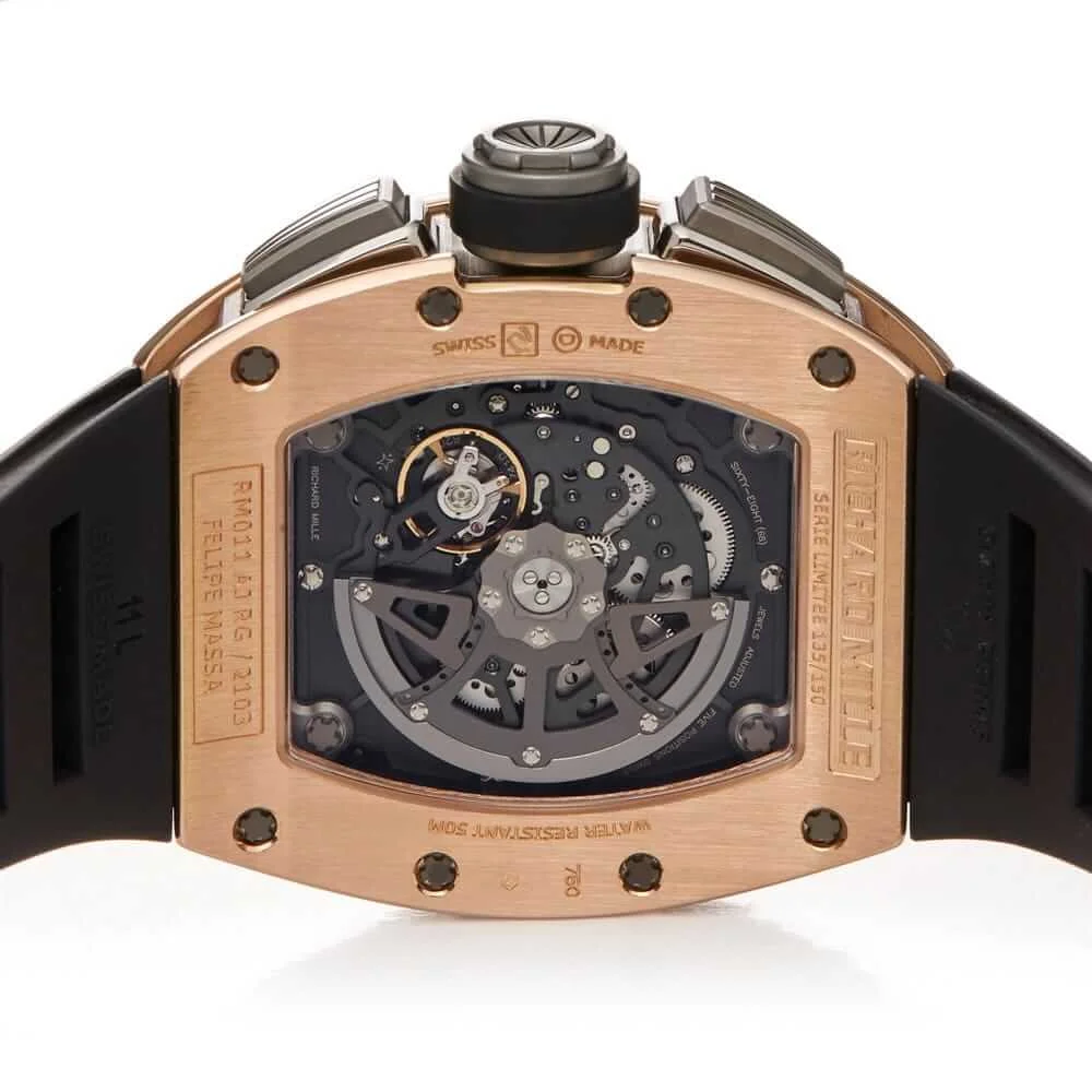 The Richard Mille RM011 Rose Gold Flyback Chronograph Automatic Replica is a luxurious watch that is sure to turn heads. It features a 904L stainless steel case with a rose gold color and a skeleton design. The bezel is also made of 904L stainless steel and is rose gold in color. The crystal is a sapphire crystal and the size is 50.00 mm with a thickness of 16. mm. The bracelet is made of rubber and is adjustable for all sizes. It has a double-fold clasp made of 904L stainless steel and is rose gold in color. With its stunning silver and white dial, the Richard Mille Hommage RM018 exudes timeless appeal. The dial is adorned with intricate details and features, capturing the essence of craftsmanship and refinement. Water-resistant and built to withstand the demands of an active lifestyle, this extraordinary timepiece is perfect for the modern man who appreciates both style and functionality. Choose between the Swiss automatic movement, which seamlessly works with your every movement, or the Japanese quartz movement, offering precise and accurate timekeeping. Whichever option you select, the Richard Mille Hommage RM018 is a symbol of prestige and sophistication, making a bold statement wherever you go.