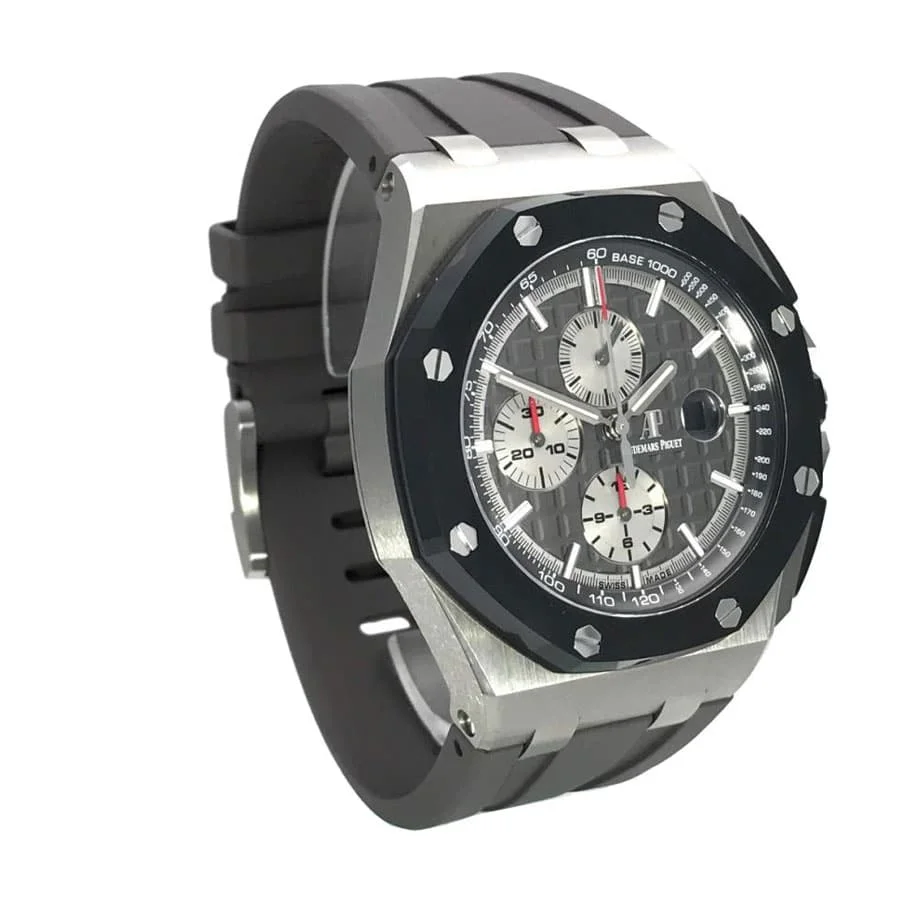 The Royal Oak Chrono Novelty Replica is a striking watch from Audemars Piguet’s Royal Oak Offshore family. It has a model number of 26401RO.OO.A002CA.01 and is powered by an automatic AP 3126 / 3840 movement with a 60-hour power reserve and a precision of (-3/+3 sec/day) within COSC certification limits. The case is made of 904L stainless steel and has a black bezel, a sapphire crystal, and a 44.00 mm size and 14.14mm thickness. The bracelet is made of rubber and is adjustable for all sizes, with a 904L stainless steel pin clasp in grey. The dial is grey with stick and dot indices, ceramic stick hour markers, and 904L stainless steel stick hands. It has functions of hours, minutes, small seconds, date, and chronograph, and has passed the 30m water resistance test. Japanese Mechanism watches may differ in materials and movements, so please contact our support team for more information.