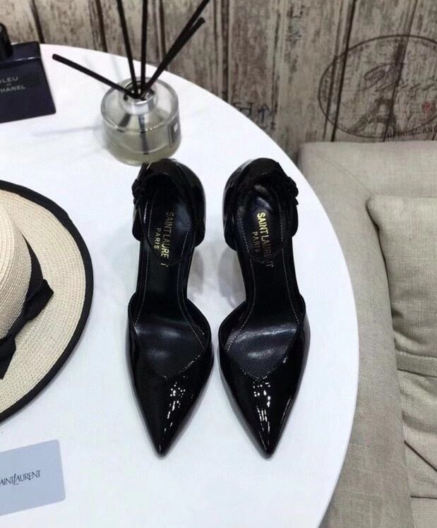 Dorsay pumps with pointed toe and low-cut pointed vamp, featuring a structured, metal ysl heel and an adjustable ankle strap-
