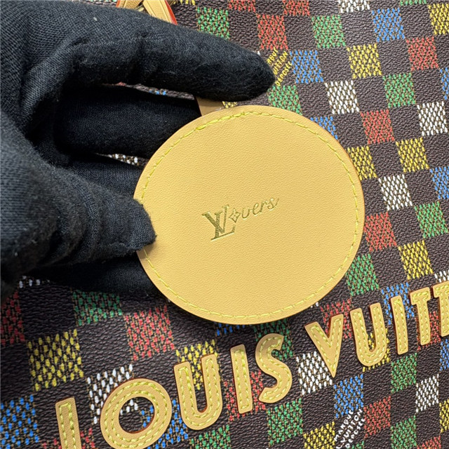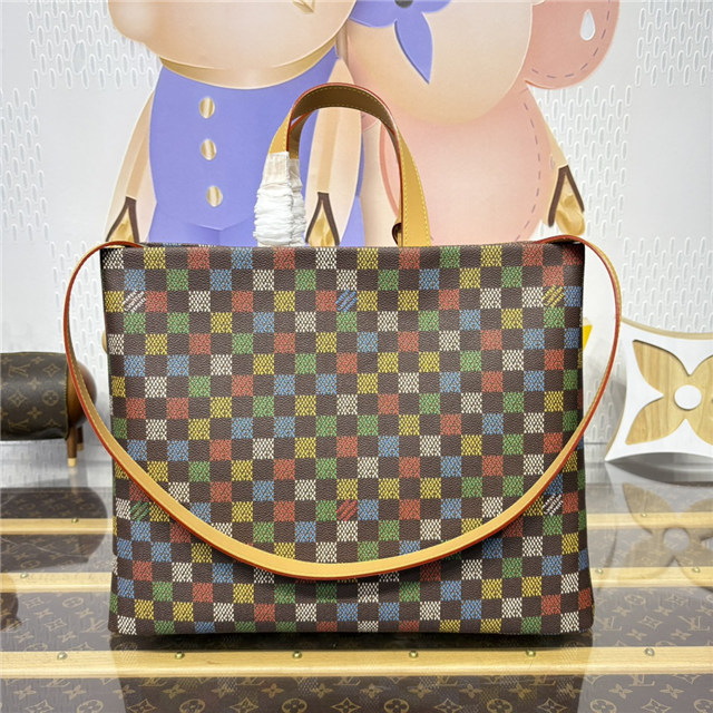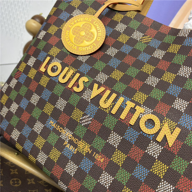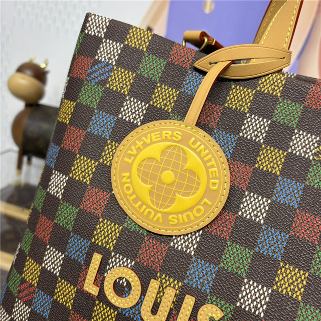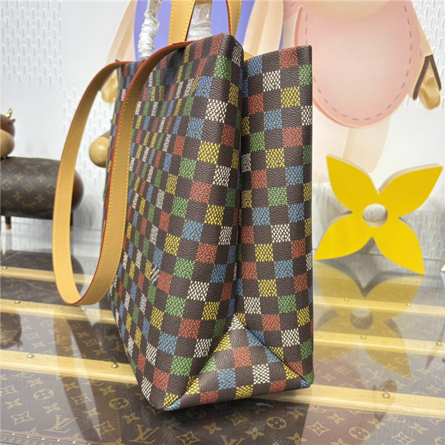 Inspired by the Louis Vuitton shopping bag, the Shopper Tote displays the same sharp lines and contrasting Louis Vuitton lettering. Here it is fashioned from LV Vers Damier Ebene coated canvas, with Pharrell Williams’ polychromatic reworking of the Damier pattern introduced by Georges Vuitton in 1888. Two top handles and a removable shoulder strap give carry options.