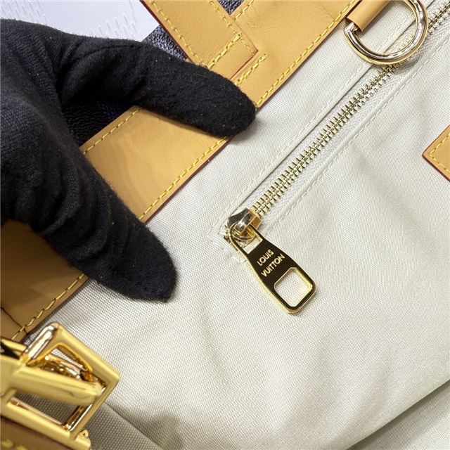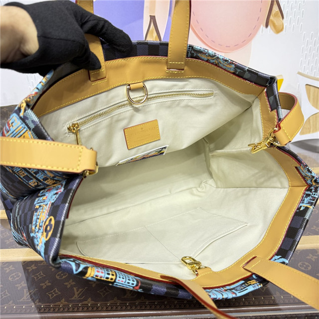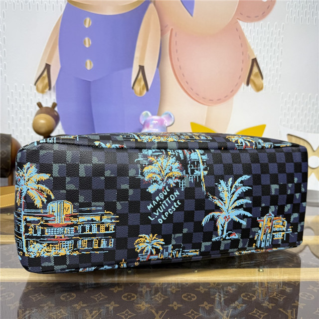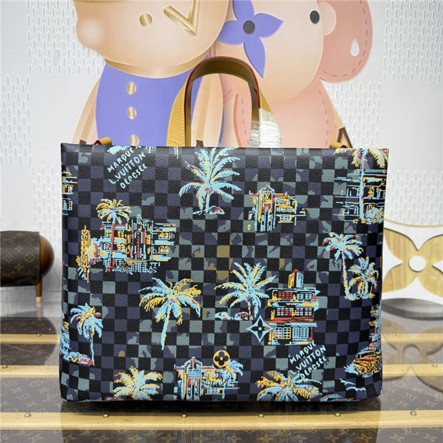 This Shopper Tote in jacquard cotton features a motif inspired by vintage Miami postcards. Capturing the city””s vibrant nightlife, the pattern showcases Miami symbols such as palm trees, iconic buildings, and a vintage car on a Marina blue background. Almost hidden in this sumptuous decor is the iconic “Marque déposée L.Vuitton” signature, embraced by Pharrell Williams.