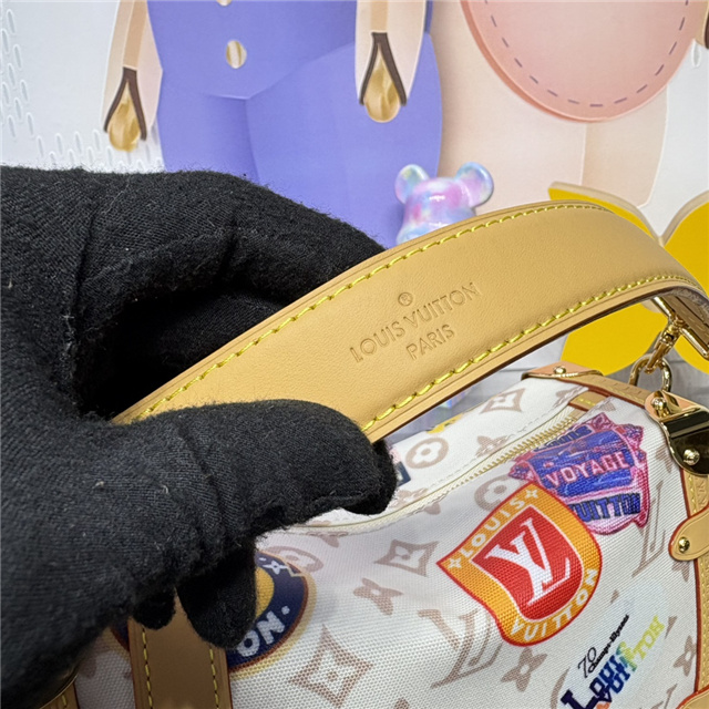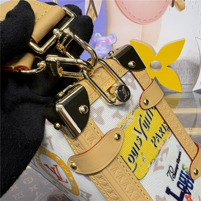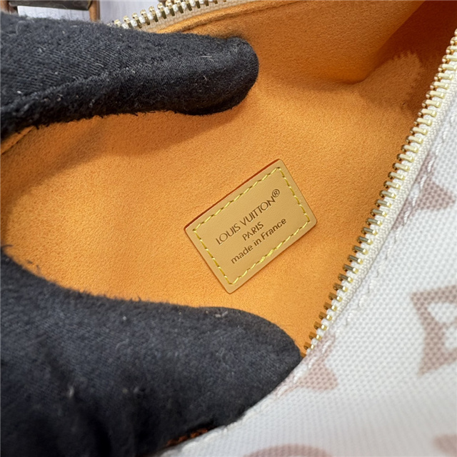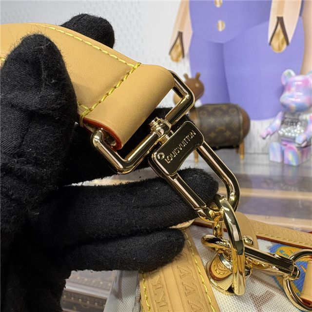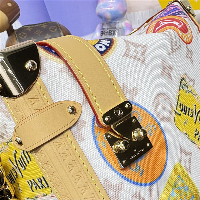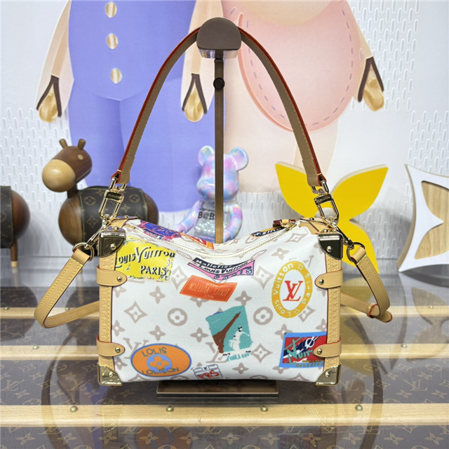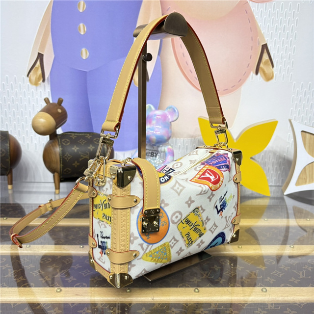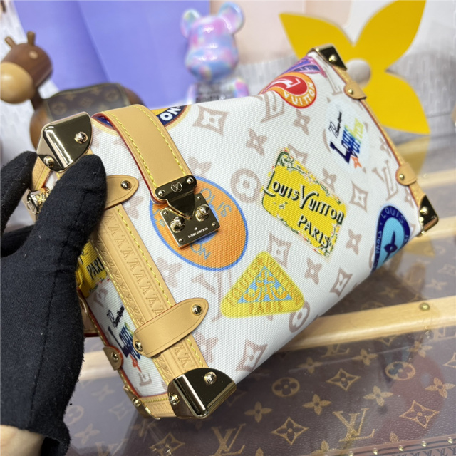 Part of the Flight Mode collection, this Side Trunk MM is offered in Monogram Dune canvas, reimagined with a vintage-inspired finish. The lightweight design is decorated with playful labels in a patchwork effect and is elevated with gold-toned hardware, including an airplane charm and signature key bell. The iconic natural cowhide leather trimmings pay tribute to the House’s trunk-making heritage.
