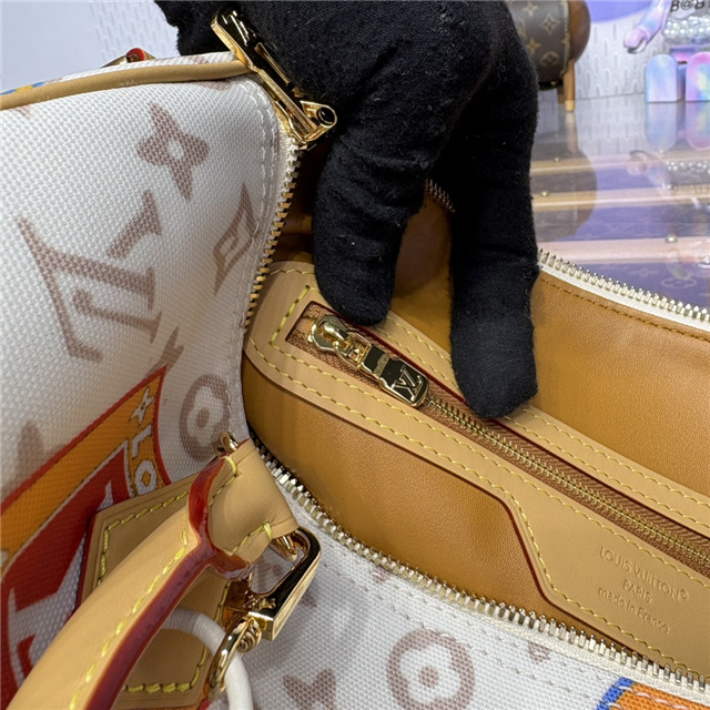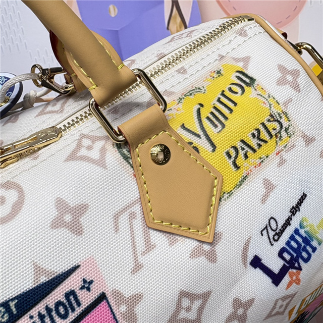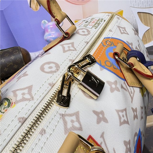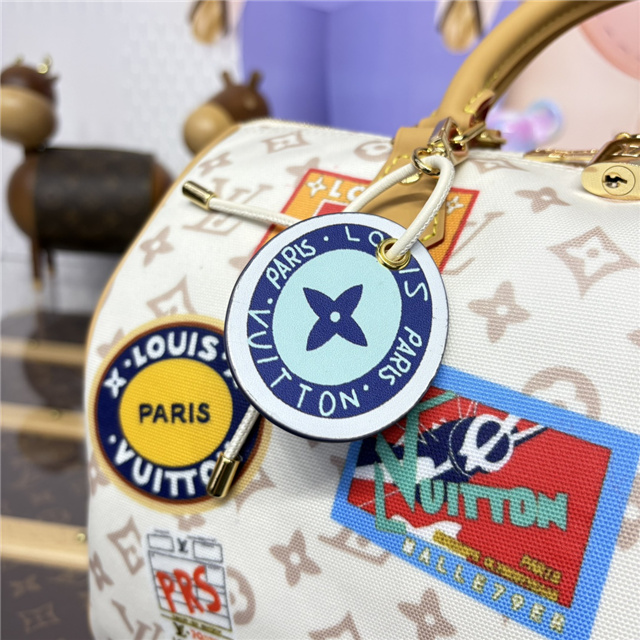 This edition of the Speedy Soft 30 showcases an updated version of the House’s Monogram Dune signature in a vintage-inspired finish. The perfect travel companion, it is decorated with an airplane charm and playful labels in a patchwork effect, which are taken from Gaston Louis Vuitton’s original collection. Attach the longer handle to wear it over one shoulder.