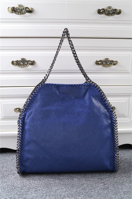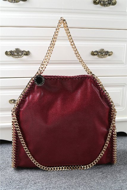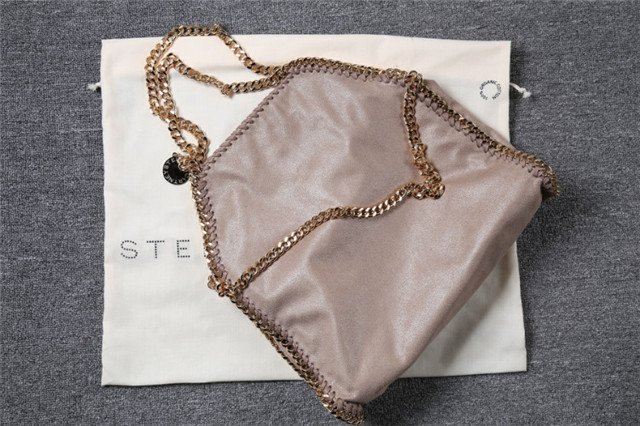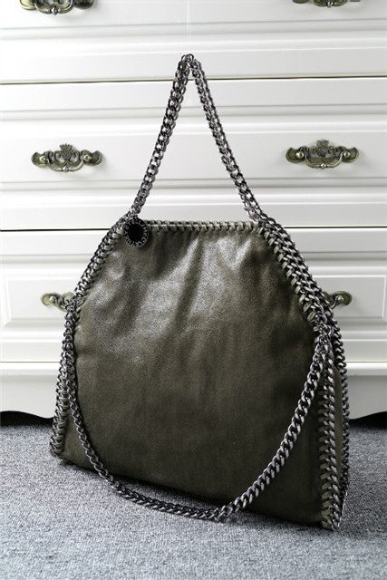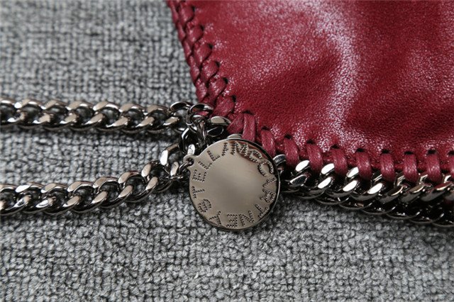 “Stella McCartney” charm hangs from top handles; 9″ drop.