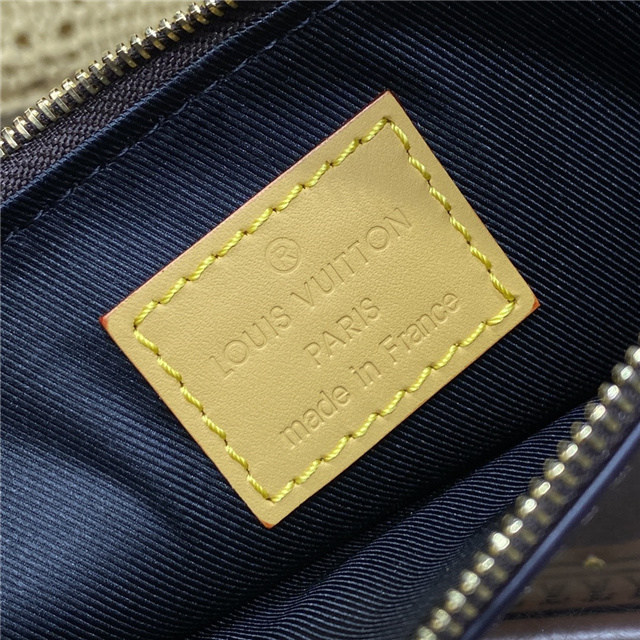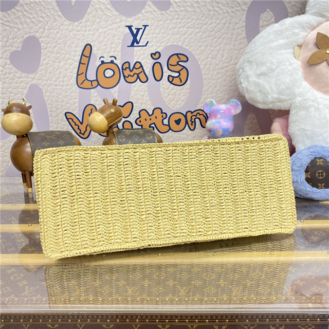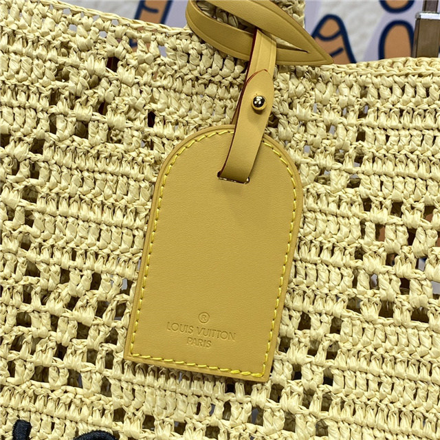 This dazzling Summer Shopper Tote is the perfect beach companion. Hand-woven from natural raffia, the shell of each tote takes about 70 hours to make. The subtle Damier checkboard is paired with a hand-made black-raffia “Louis Vuitton” signature. This practical bag has a leather bottom for a structured look and an inside detachable pouch.