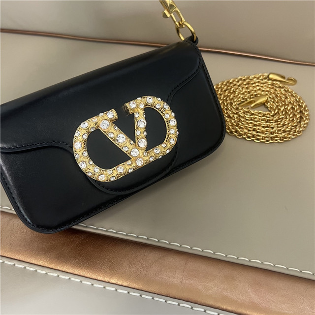 Valentino Garavani Locò small shoulder bag in laminated calfskin leather with VLogo Signature jewel element. Equipped with both a detachable sliding chain and a detachable handle, this accessory can be worn as a crossbody/shoulder bag or carried as a handbag.