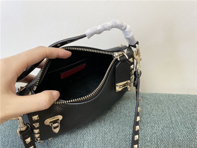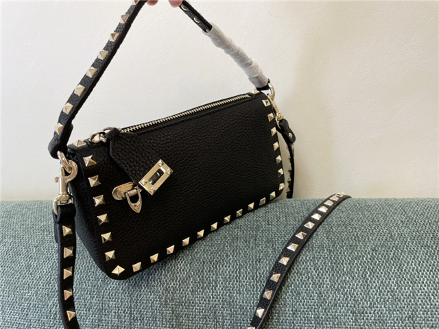 Small Valentino Garavani Rockstud crossbody bag in grainy calfskin leather. The iconic hook closure is reinterpreted to secure the zip pull.