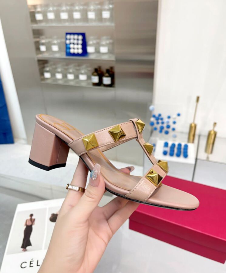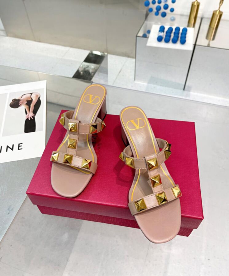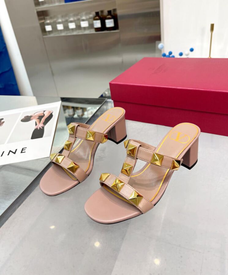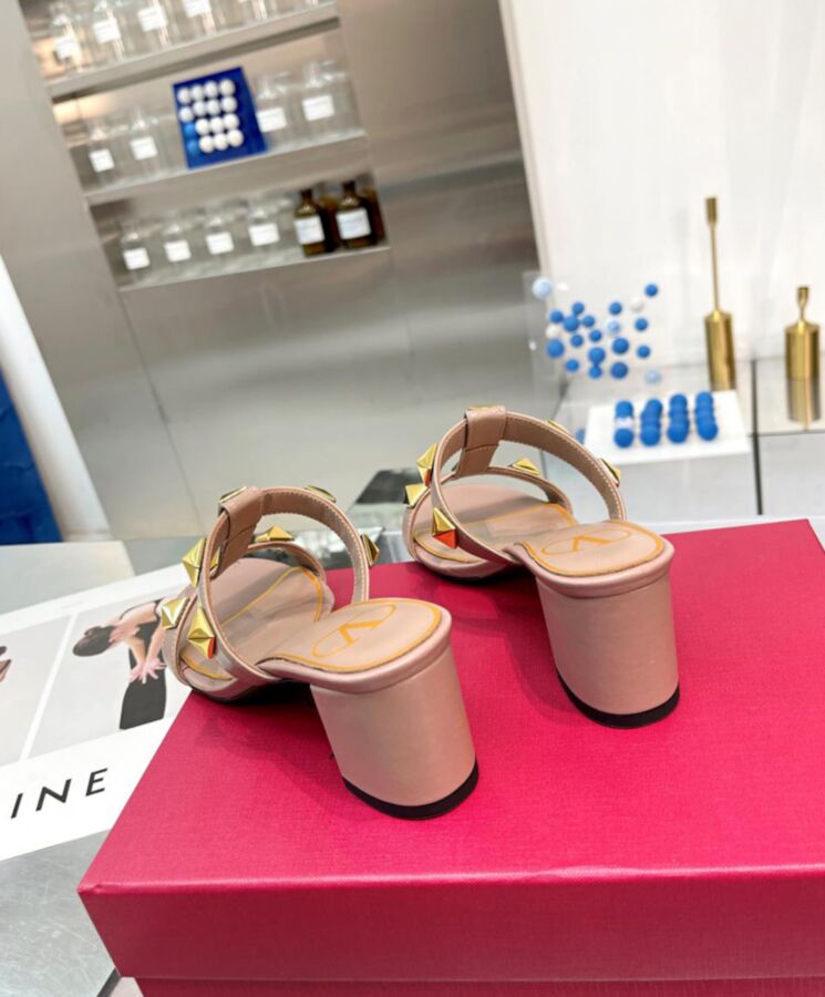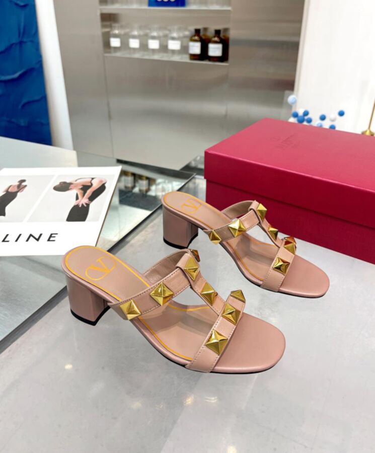 Valentino Garavani Roman Stud slide sandal in calfskin. 18×18 mm / 0.7×0.7 in maxi studs with antique-brass finish Wide leather-covered heel Heel height: 60 mm/2.4 in.