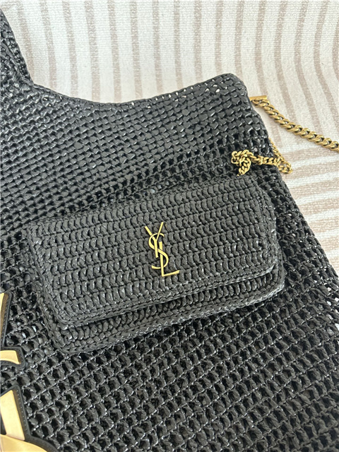 IT FEATURES A RAFFIA SUNGLASSES CASE WHICH CAN BE REMOVED THANKS TO ITS LONG CHAIN.
