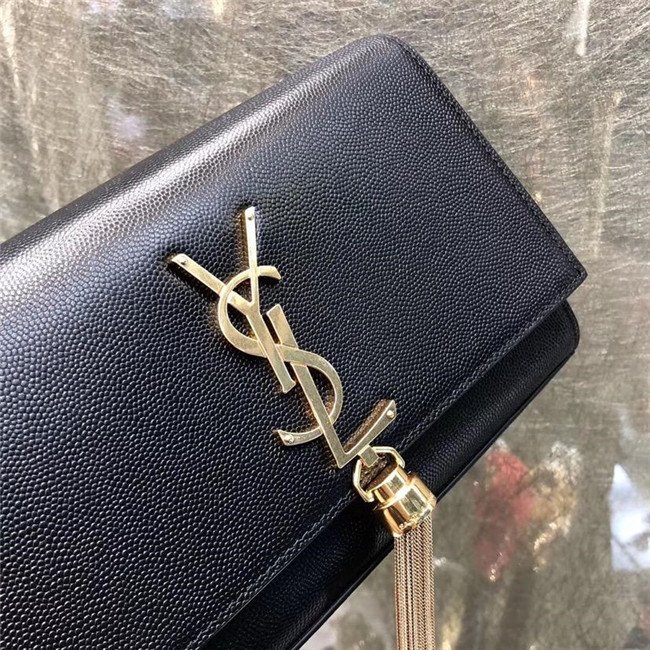 BAG WITH FLAP DECORATED WITH A TASSEL AND METAL YSL INITIALS AND FEATURING A CHAIN SHOULDER STRAP.